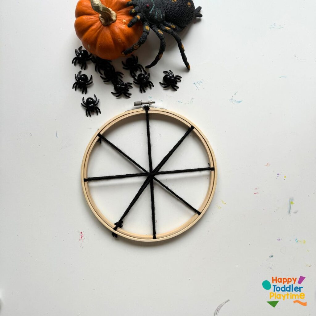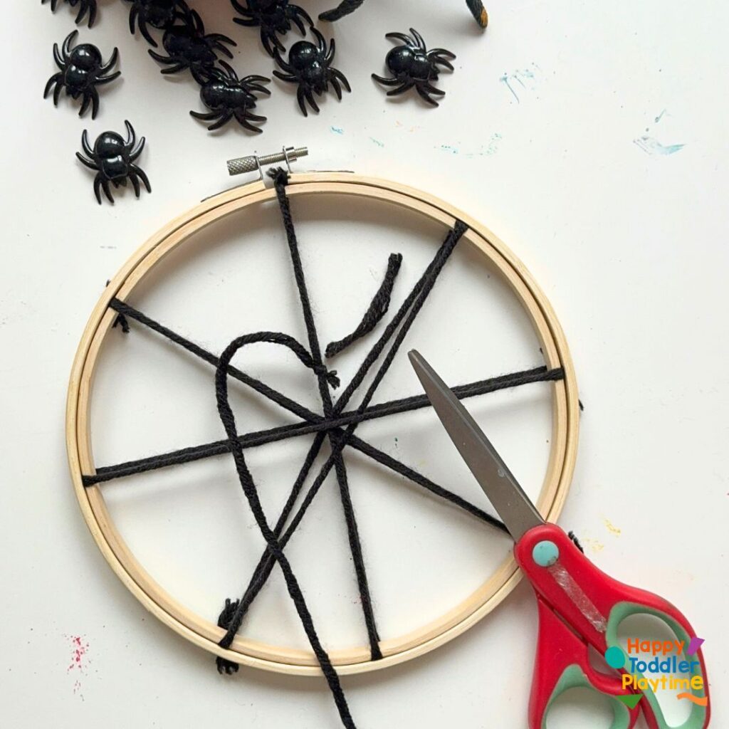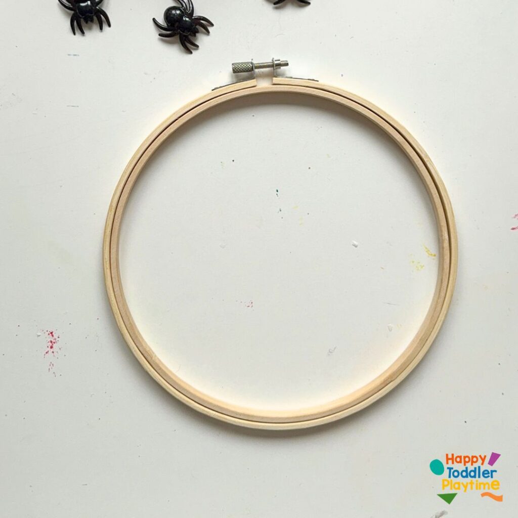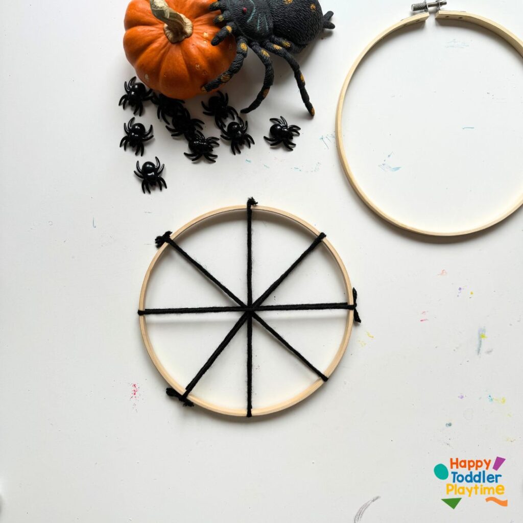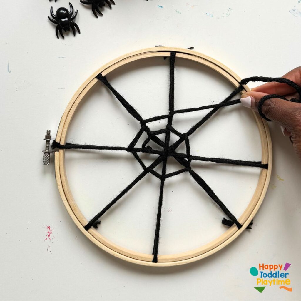 Take a long piece of yarn (about twice the diameter of the hoop) and cut and tie one end securely to the hoop. This will be the beginning of your web design. Don’t worry if it looks simple at first; it will take shape as you add more layers.