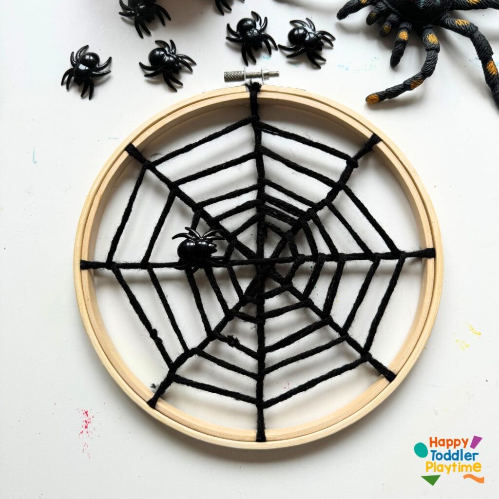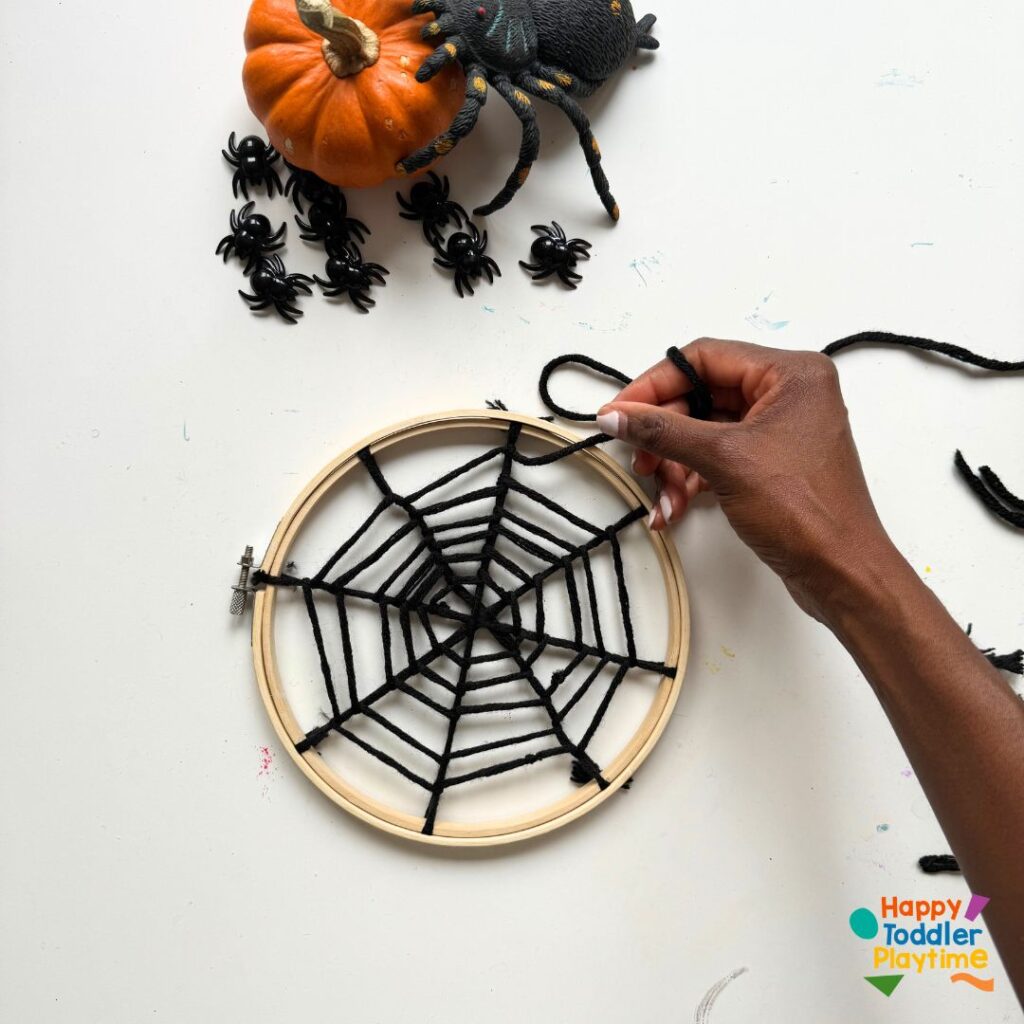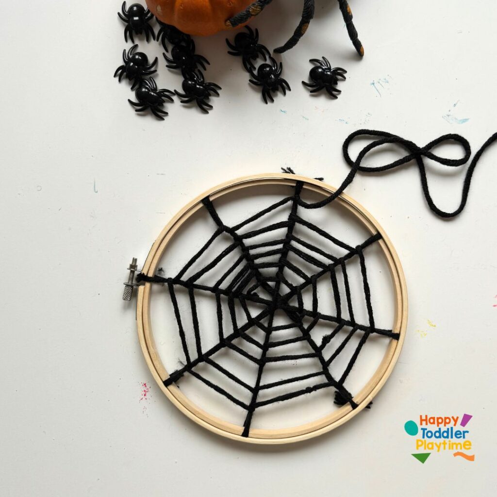 Once complete, your spider web is ready to display. Tie a piece of yarn to the top of the hoop to hang it up on a nail, hook, or even from a door handle.