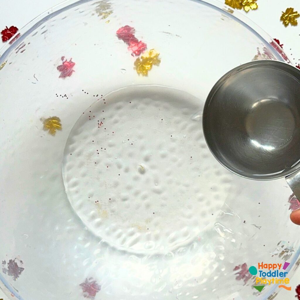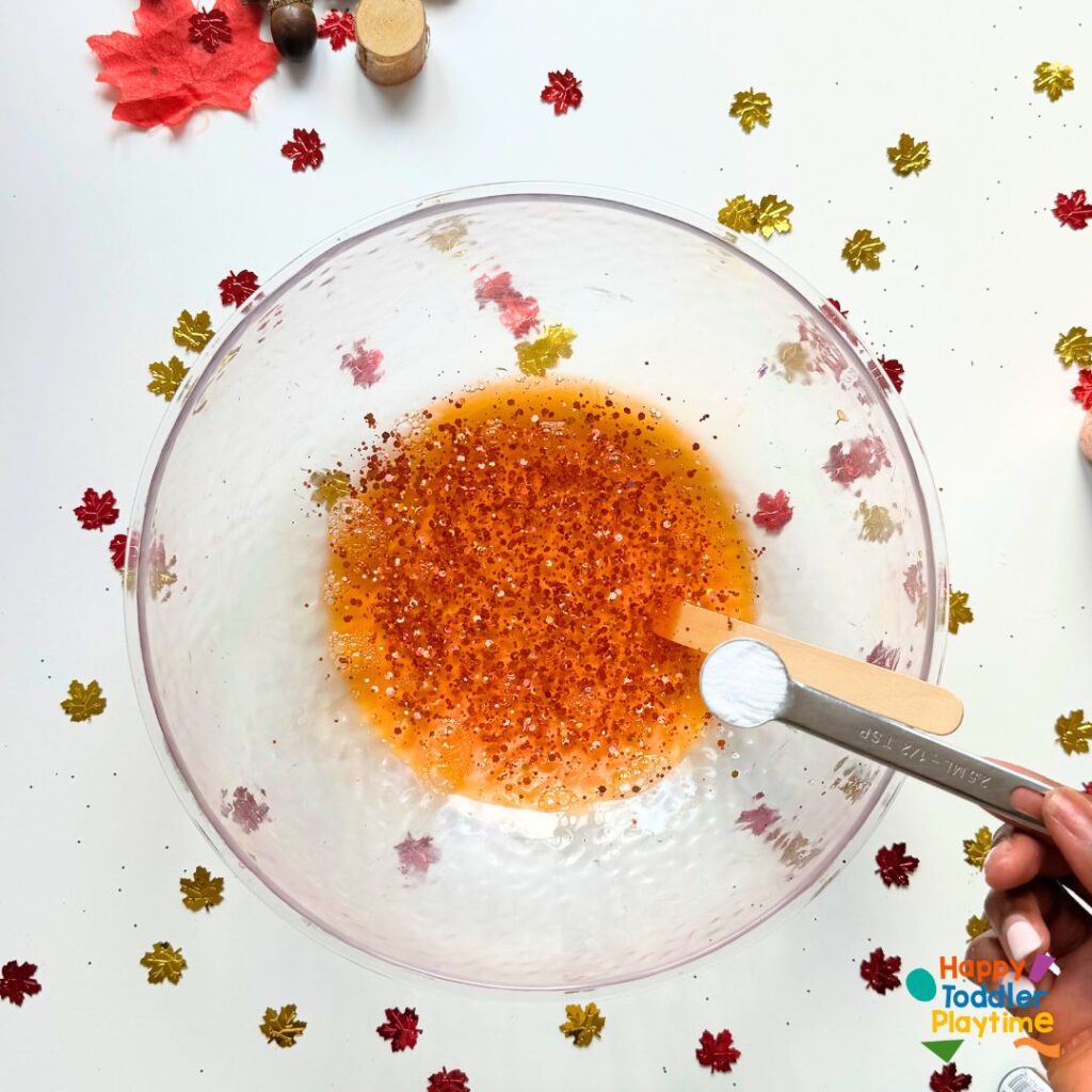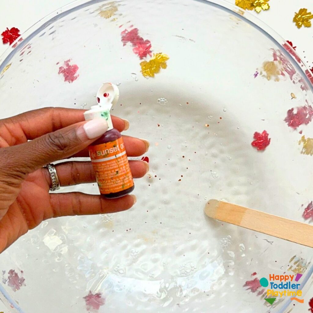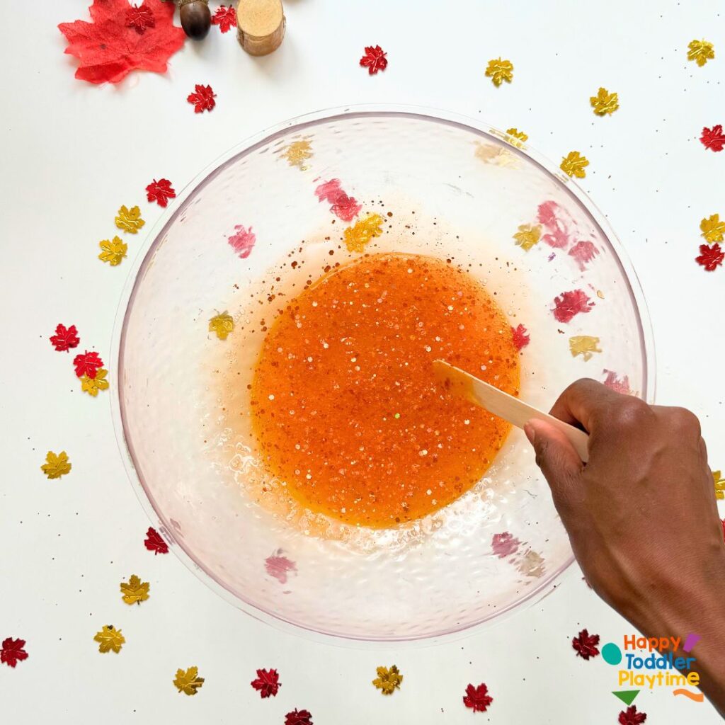 2. Add Color and Sparkle: Add a few drops of red, orange, or yellow food coloring—whichever fall color you like best. Stir the color through the glue mixture until it’s nice and even. Now, sprinkle in some red, orange, or gold glitter (or a mix for extra sparkle!).