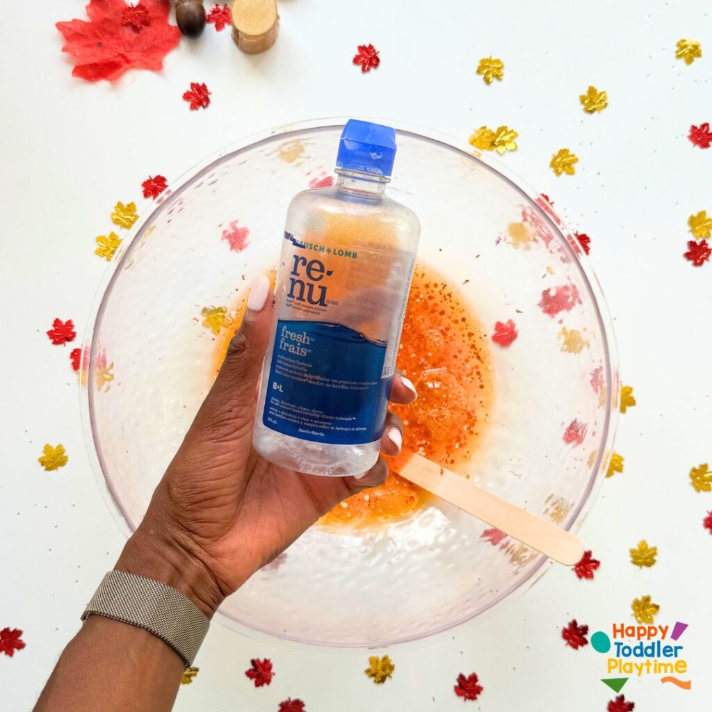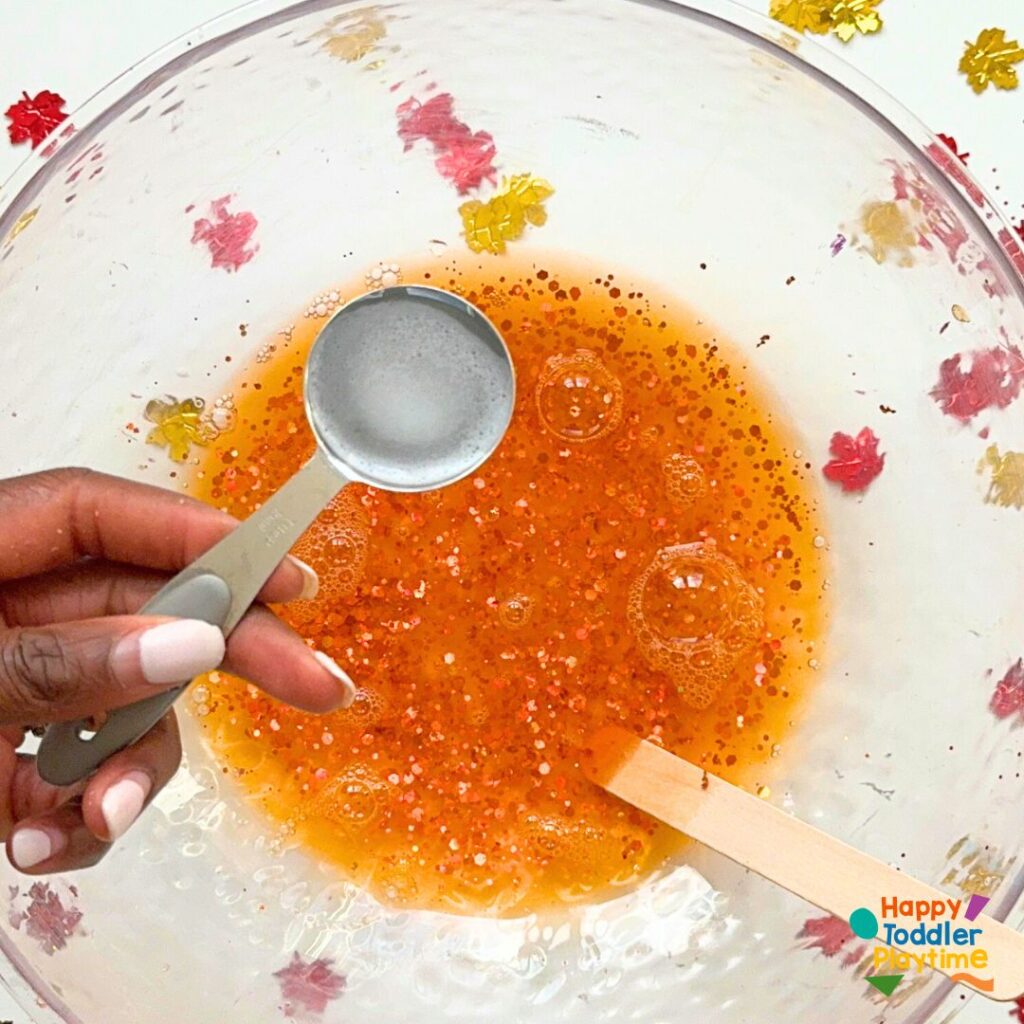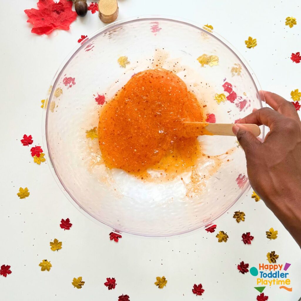 6. Store and Enjoy: If you have leaf confetti, this is the time to add it to the slime. Once your fall slime is just right, store it in a reusable container. You’ll be able to take it out whenever you need a little fall-themed fun!