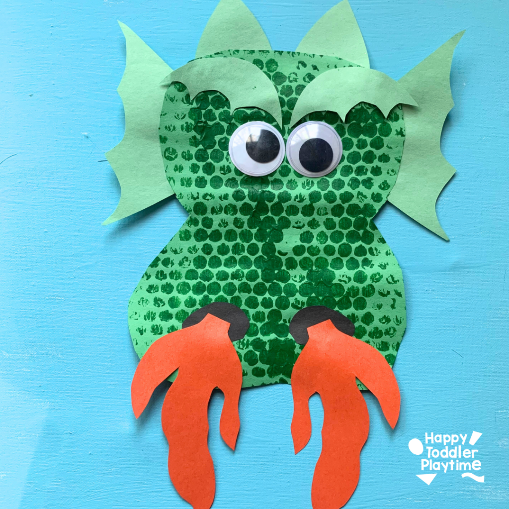 Dip bubble wrap in paint and press it onto the dragon cutout for a textured look. Cut out and glue onears, horns, eye brown and nostrils and flame.