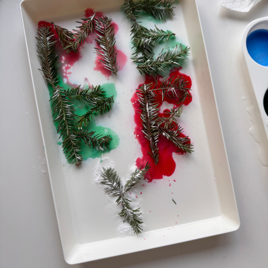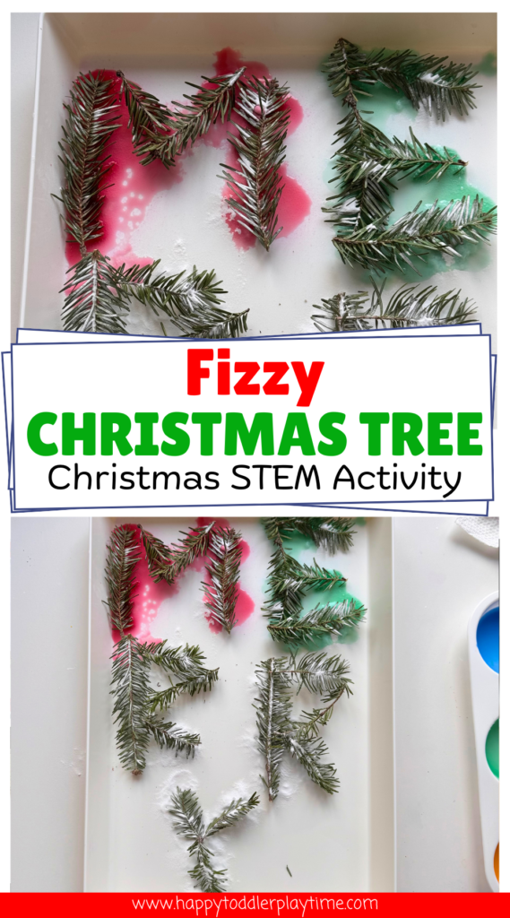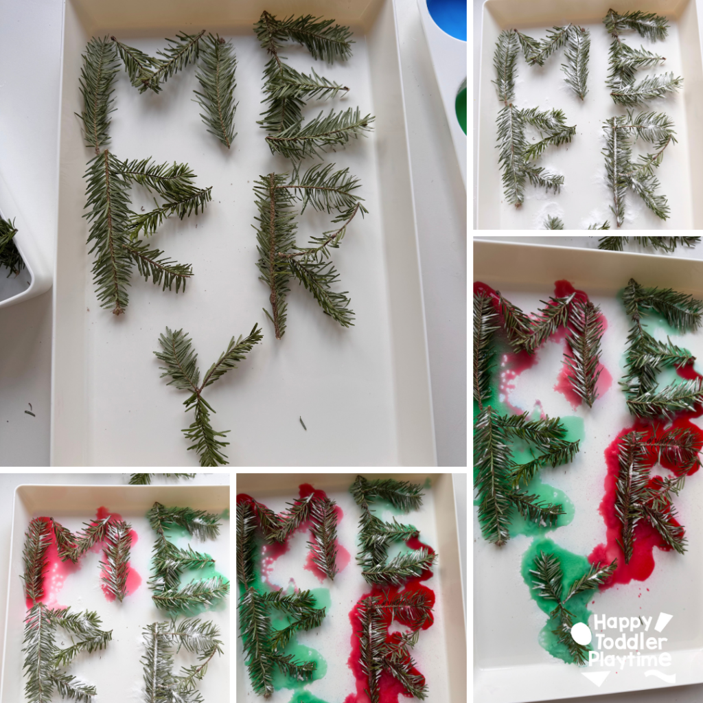 We did this with tiny cut pieces from the ends of our Christmas tree branches (the bits you usually trim off anyway). They become your “letters,” and kids get to build a Christmas word like MERRY, JOY, or NOEL before making it bubble and fizz. It’s science, sensory play, and a little fine motor practice rolled into one.