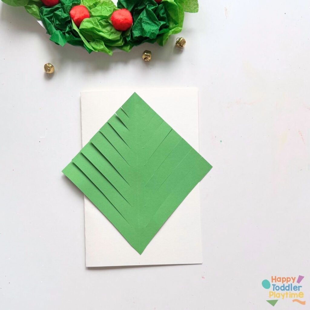 Fold a piece of white cardstock in half to create the card base. Open up you there green construction with the slits. Measure and cut the bottom of it so that is fits from entirely on the card. In other words, if the diamond shape is too big to fit on the card, shorten it by cutting some off the bottom.