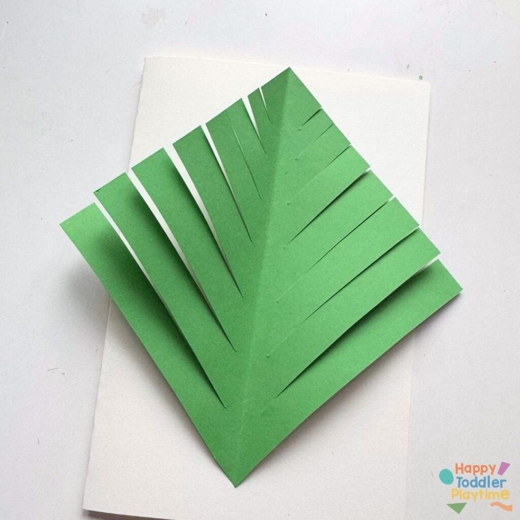Starting at the bottom, take each strip and fold it toward the center line without creasing the end. Alternate sides as you work your way up the tree, folding each strip into the center. This creates the 3D layered look.