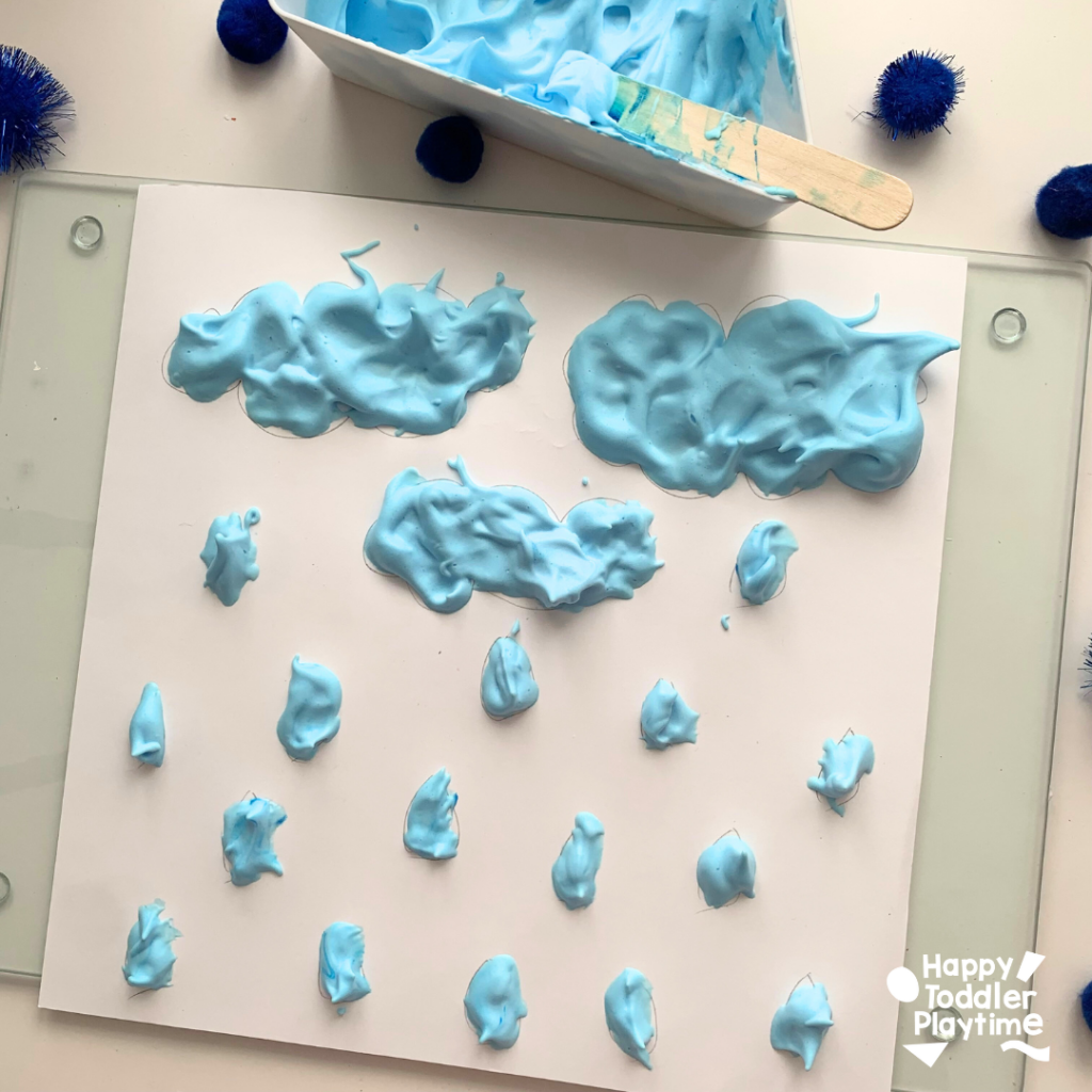 Mix 1 cup shaving cream with 1/2 cup school glue in a bowl and a few drops of blue food coloring. Draw cloud a rain drops on white cardstock. Use paint brush to fill in the blue puffy paint. Allow it to dry.