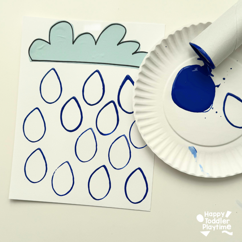 Cut out cloud from construction paper. Glue to top to page. Shape toilet paper roll in the shape of a rain drop. Dip it into blue paint and stamp raindrops under the cloud.
