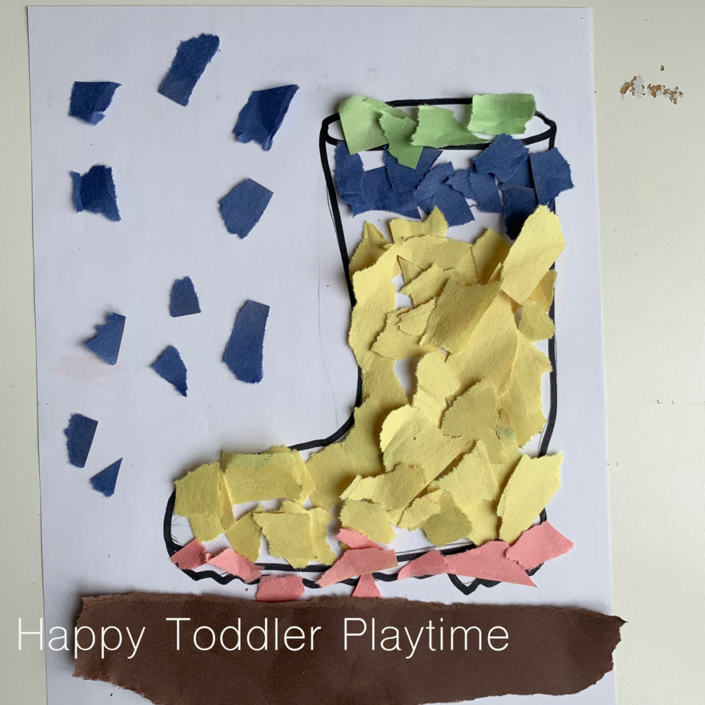 Draw boot shape using markers. Tear paper in small pieces. Glue on to boot.
