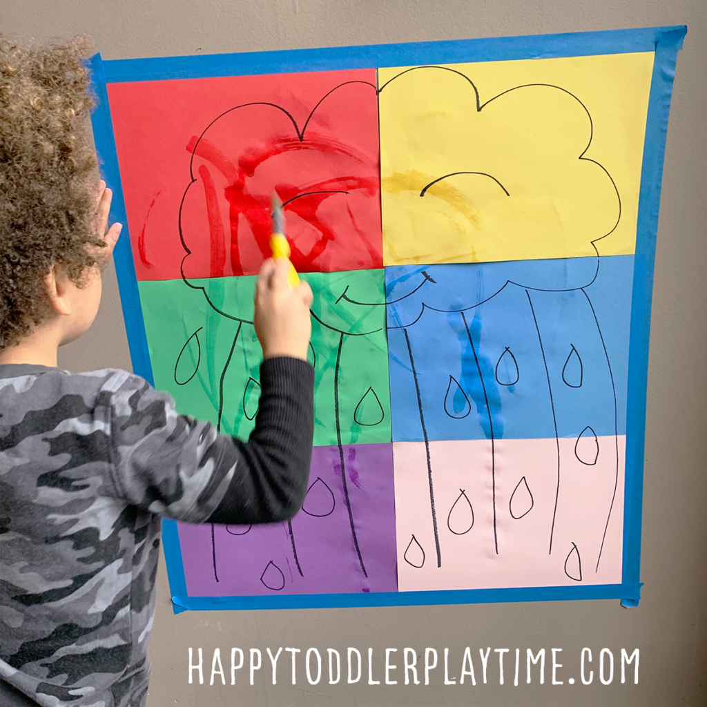 Tape construction paper to wall. Draw a rain cloud using sharpie. Let your child paint it with paint brush and water.