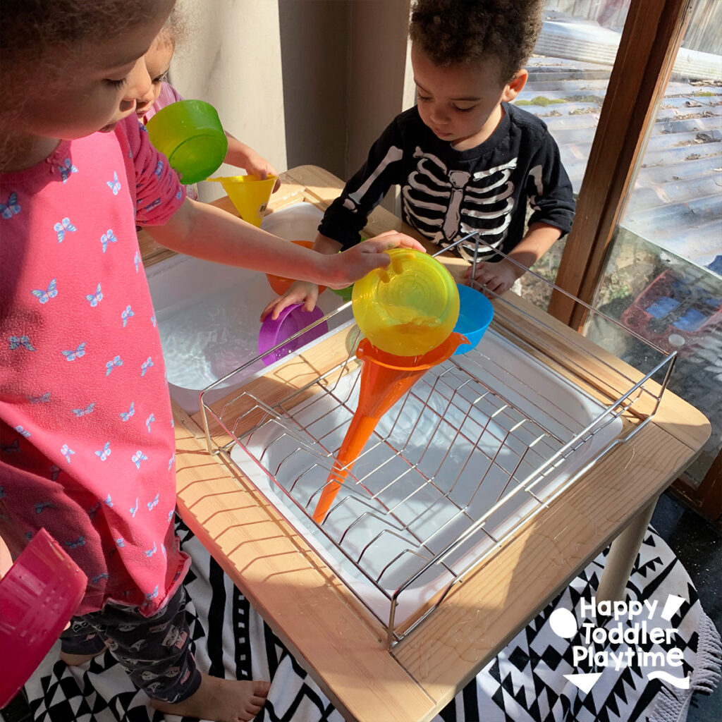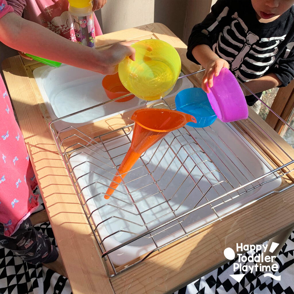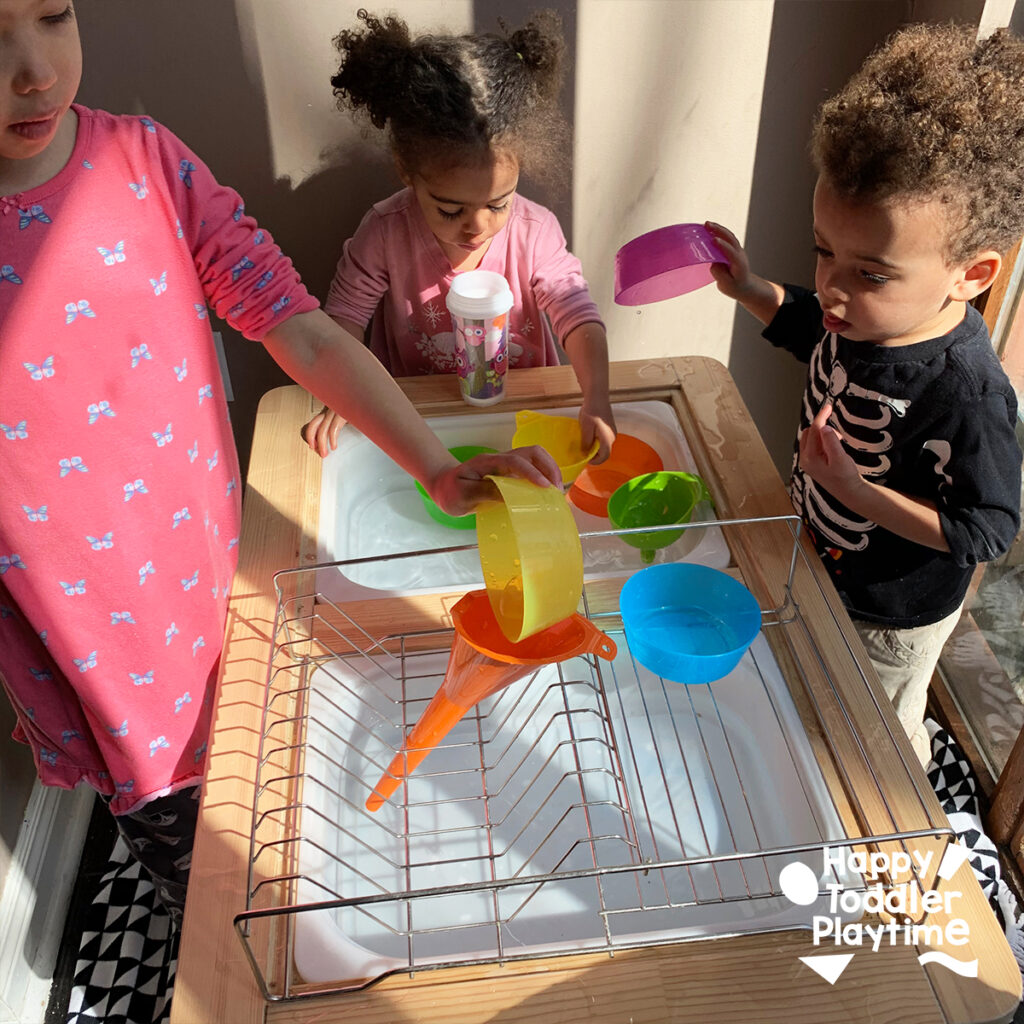 For this activity, you can use either a water table or a large sensory bin. A water table is great for multiple kids to play at once and provides ample space for pouring and experimenting.