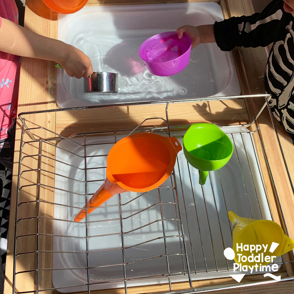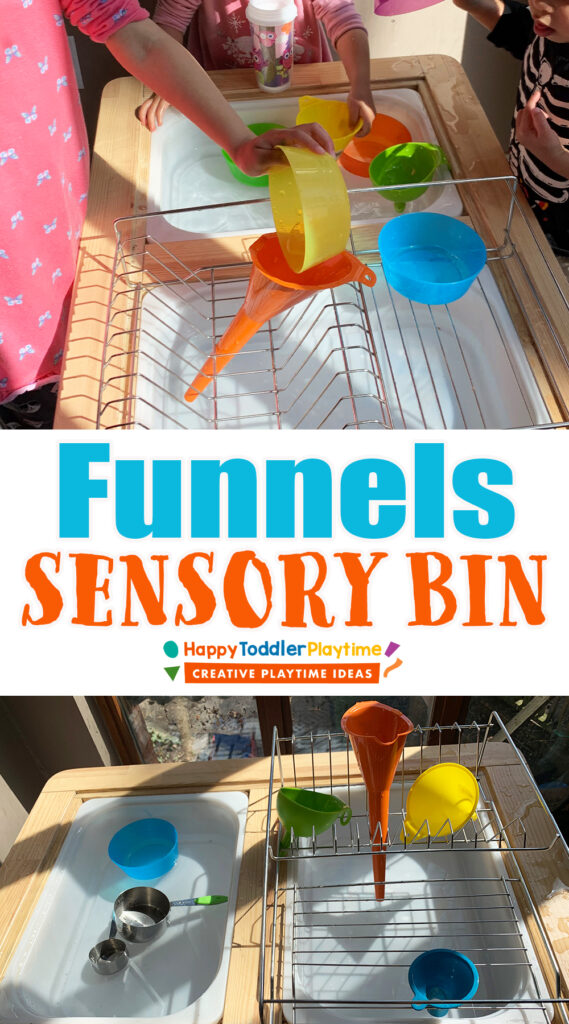 Plus, it’s a wonderful sensory experience that involves touch, sight, and even sound as the water splashes and trickles through the funnels.