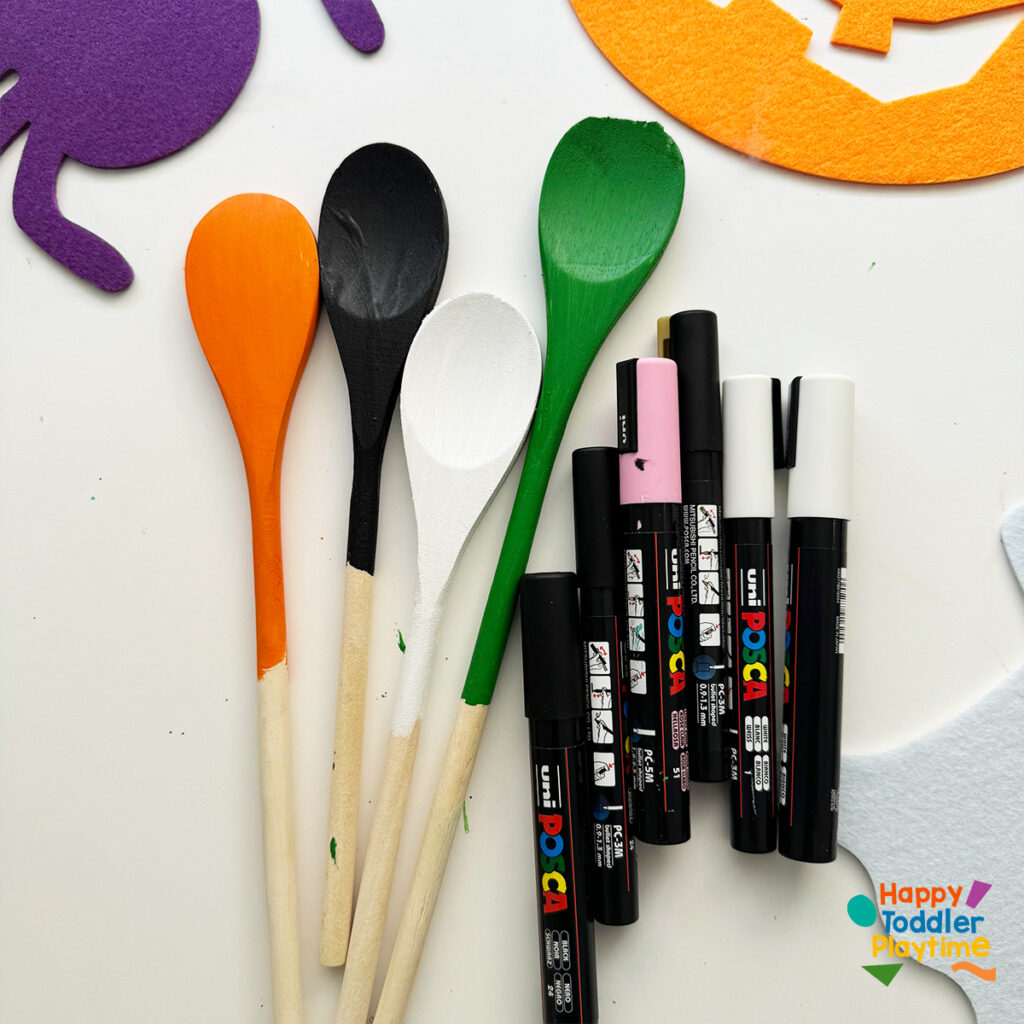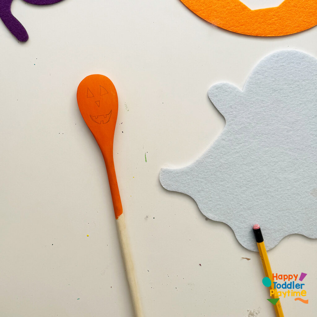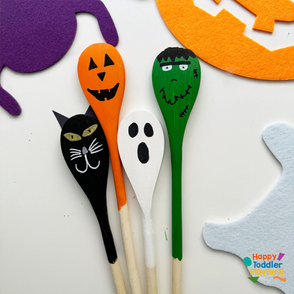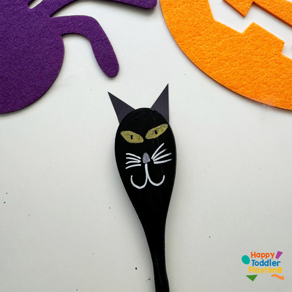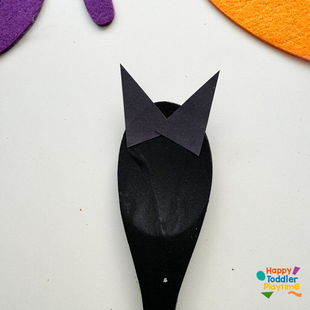 Use different sized wooden spoons and spatulas to create a variety of Halloween characters. You can add accessories like a witch’s hat, fangs for a vampire, or even a little bow for a festive touch. You can use construction paper to add these details. For instance for the black cat, we cut out black triangles from black construction paper. Then glued them on the back of the spoon.