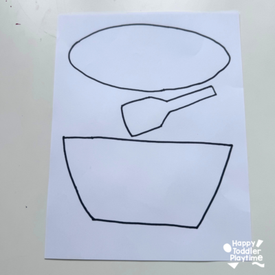 Next, cut out a spatula and tongs from white construction paper. Use your marker to add simple details like lines for the spatula slats and loops for the tongs.