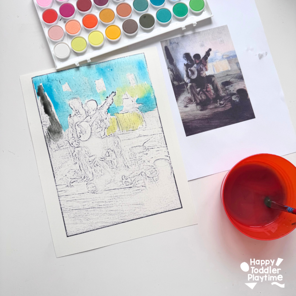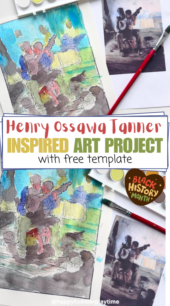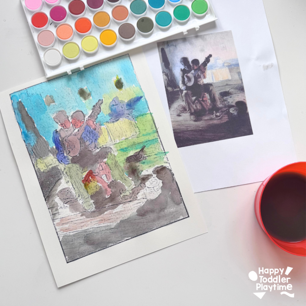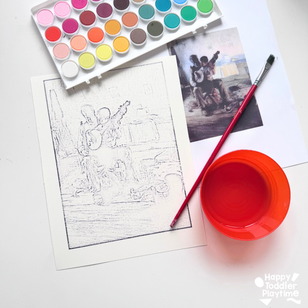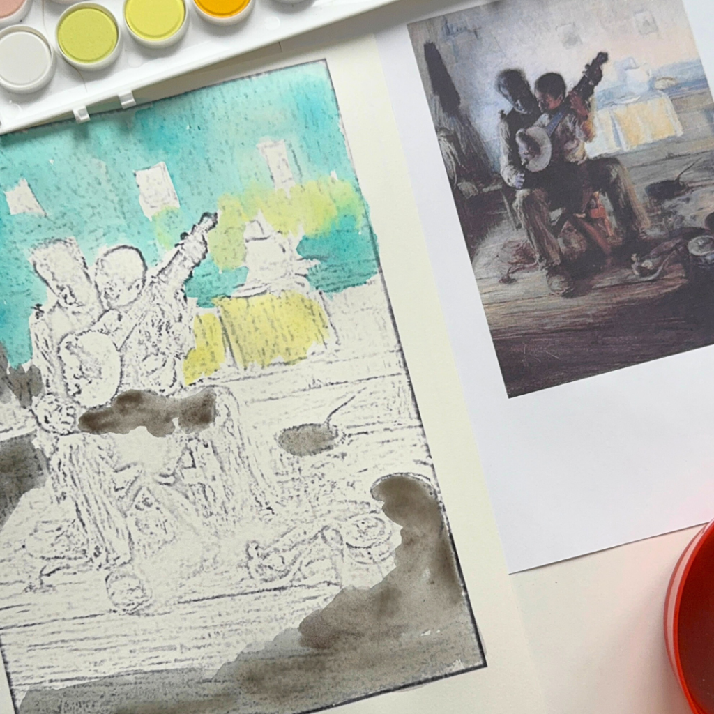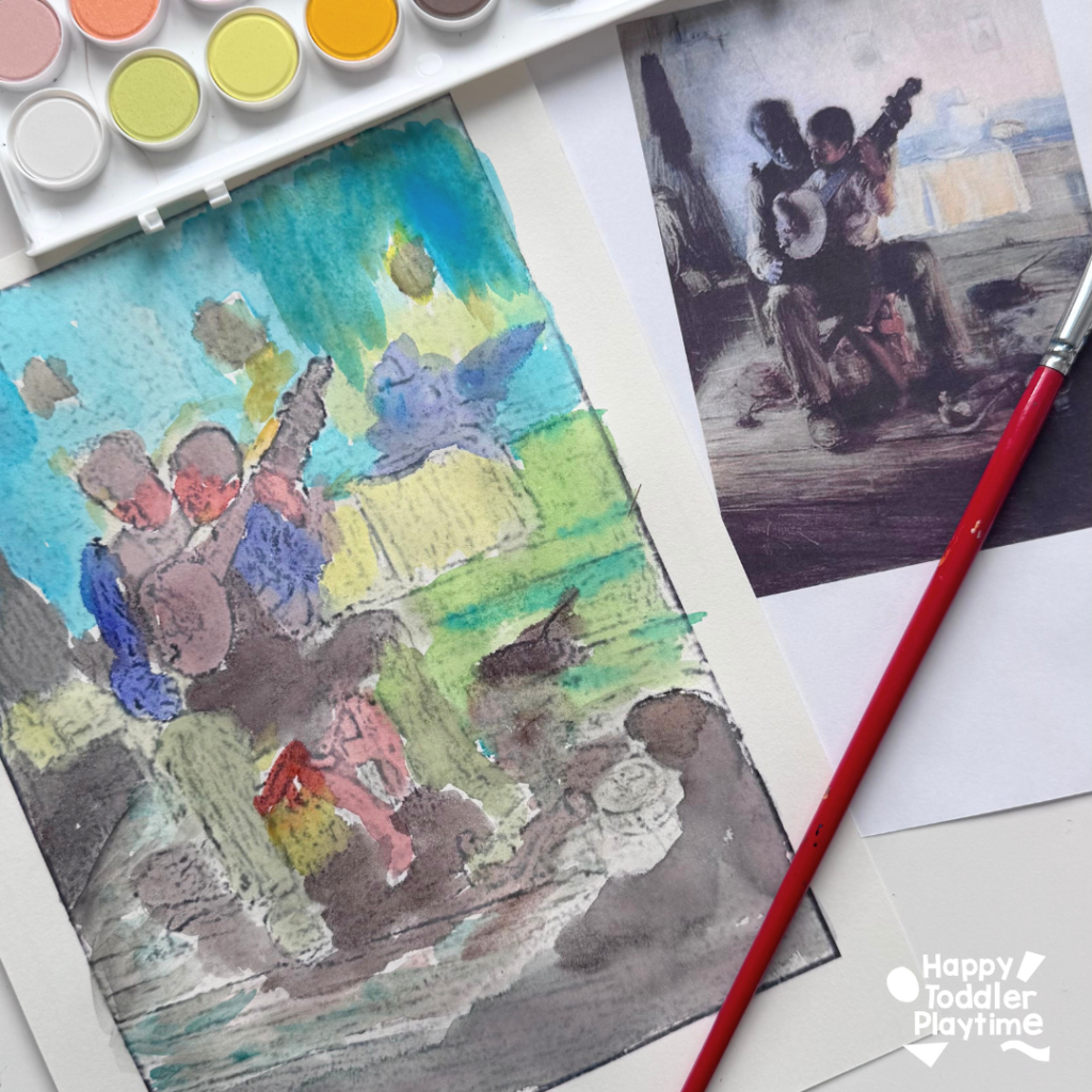 This Henry Ossawa Tanner-inspired watercolor art project, based on his famous painting The Banjo Lesson (1893), is the perfect easy art project for kids. With just watercolor paper, paints, and a brush, kids will get to explore storytelling through art while creating their own version of this beautiful masterpiece.