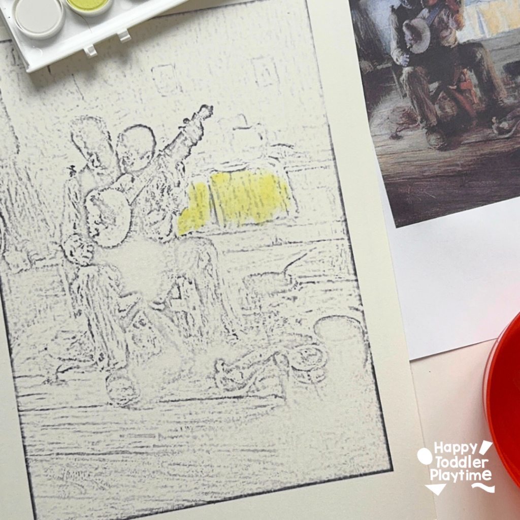 - Once the main areas are dry, add small details—the banjo strings, facial expressions, and folds in the clothing. Encourage kids to take their time and notice how shadows add depth to the painting.