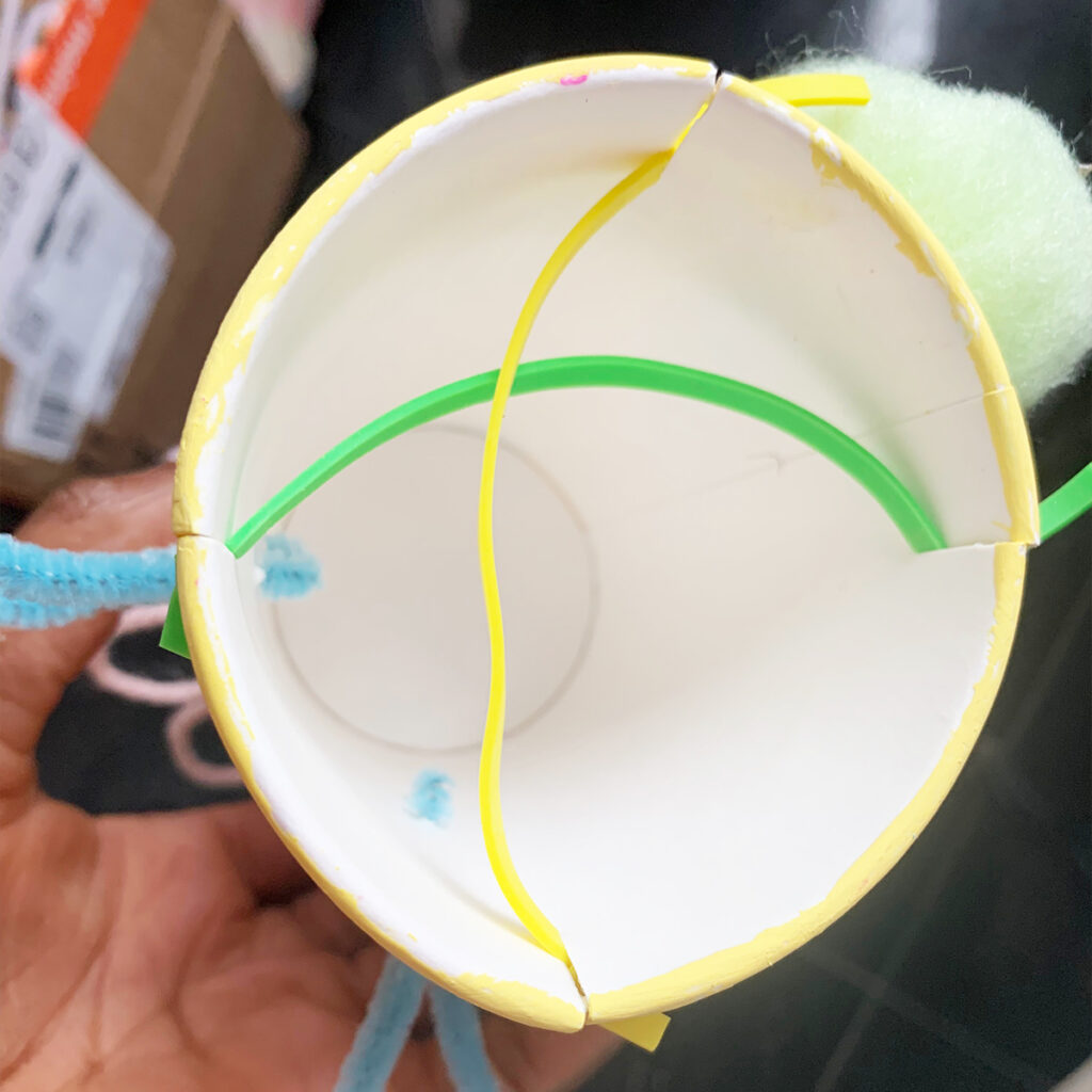- Slide one end the elastic bands down one the slits in the cup and the other end across from it. Repeat with the second elastic band so that the two bands are crossing to create an ‘X’.
