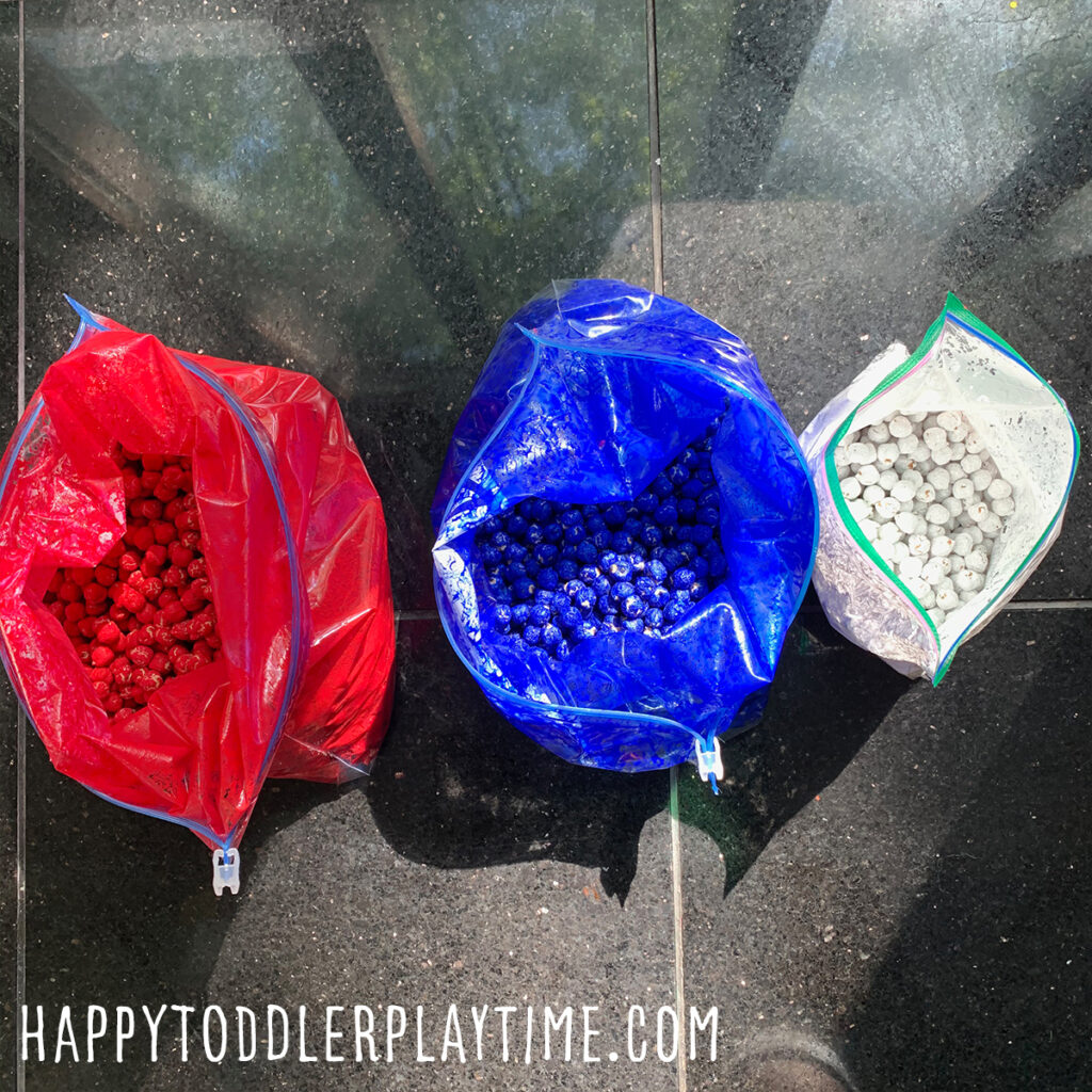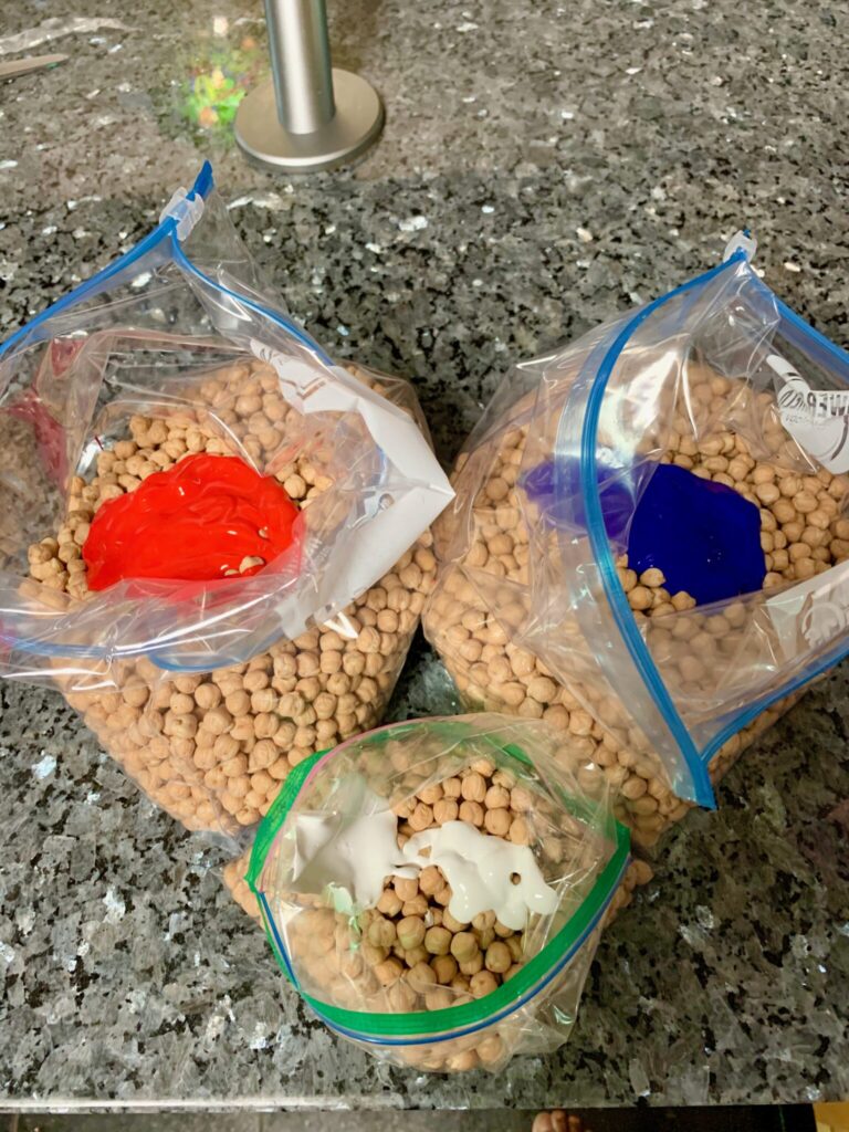 - Fill a ziplock bag with dried chickpeas. Add several squirts of tempera paint. Use a generous amount to get a vibrant color.