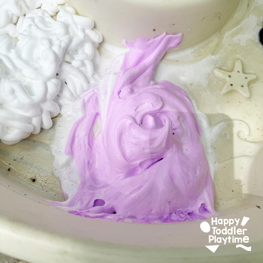 - Make the Ice Cream Base: Fill the table with three or four piles of shaving cream. Add a few drops of washable kids paint to the shaving cream and mix until the paint is completed mixed in. Choose colors that are complementary so that when the colors get mixed up they don’t create a gray or brown color. You can make different colors to represent different flavors.