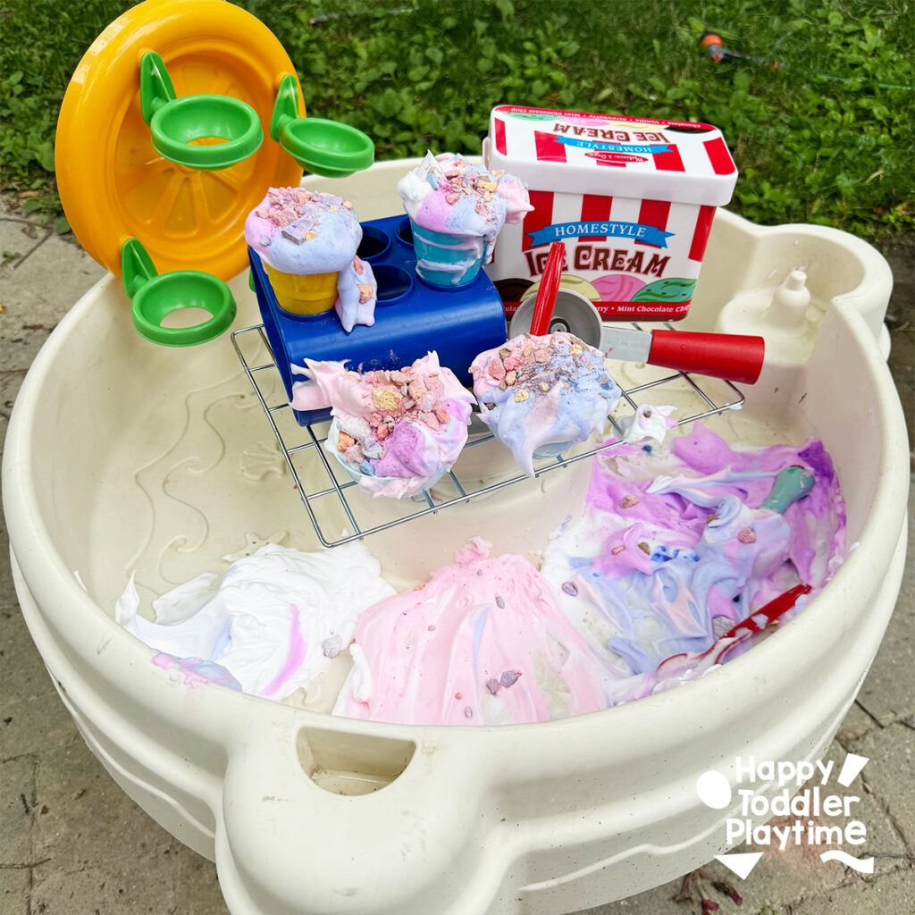 This activity combines the convenience of a water table with a pretend ice cream shop, allowing kids to scoop, mix, and serve their own “ice cream” creations.