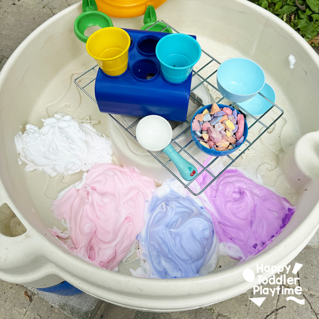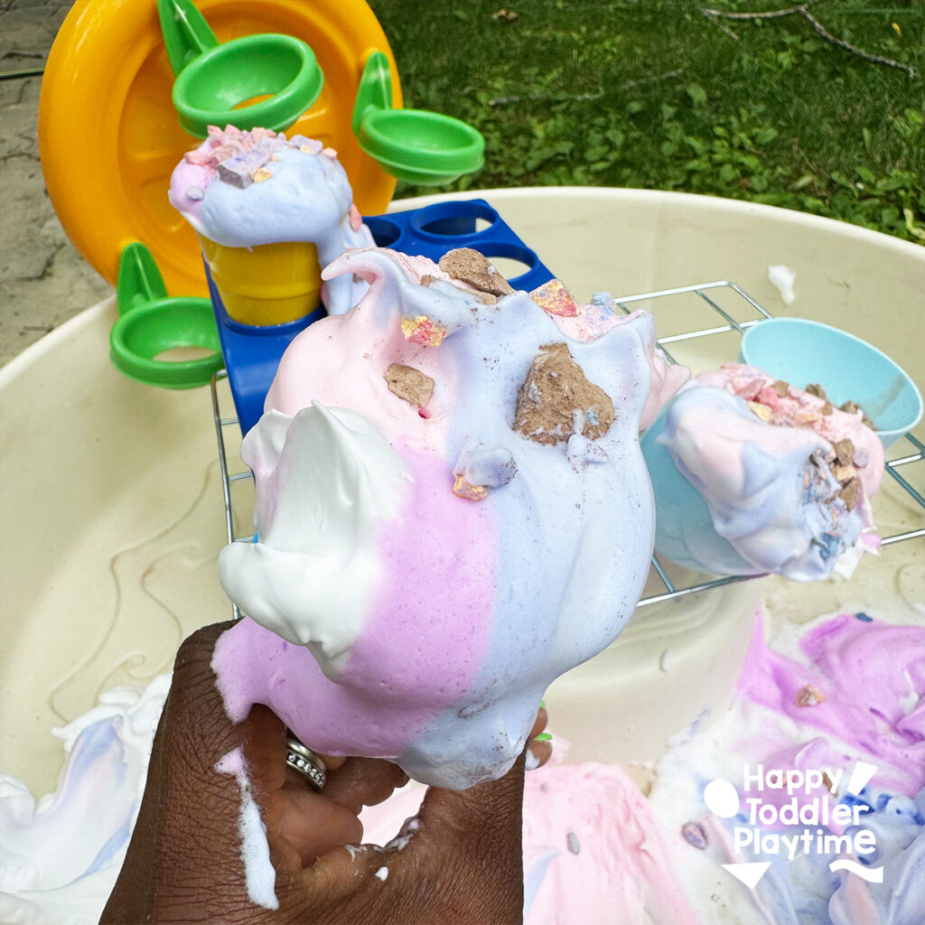- Let the Fun Begin: Show the kids how to scoop the shaving cream “ice cream” into the toy cones and decorate with the chalk sprinkles. Encourage them to mix colors and come up with their own unique ice cream combinations.