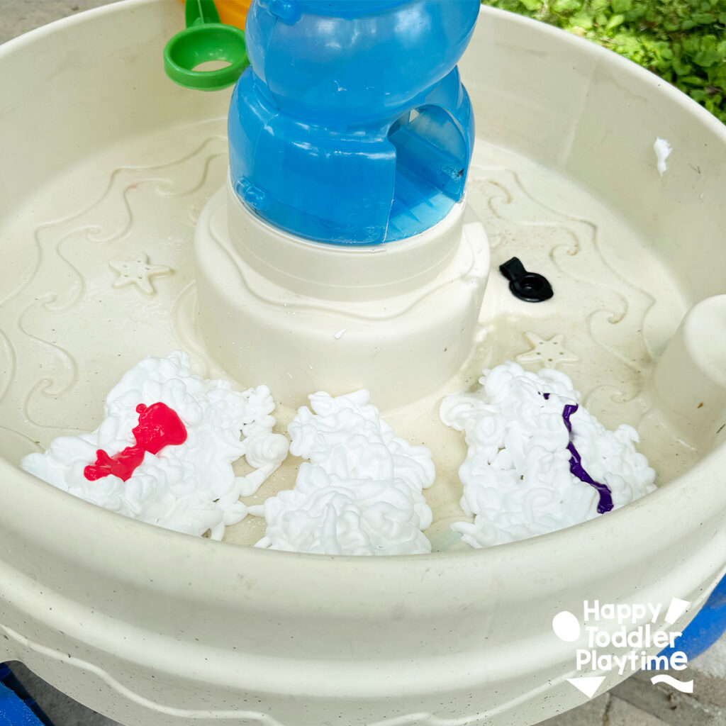 When they are done playing add water to the water table invite them to wash off all the dishes to create a shaving cream soup.
