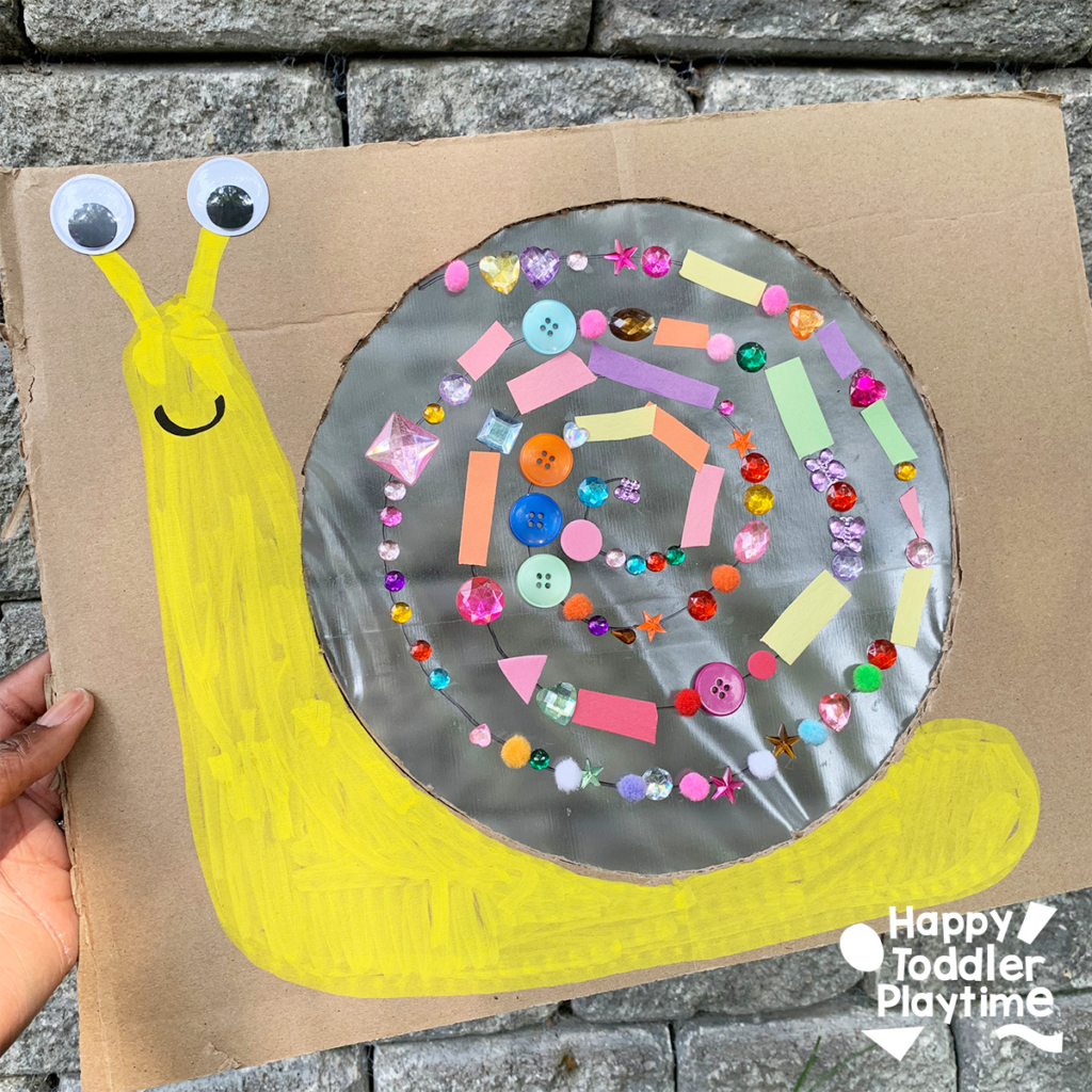 This simple and fun craft lets kids decorate a snail shell using colorful paper pieces on a sticky contact paper board. It’s a great low-mess activity that builds fine motor skills and creativity.
