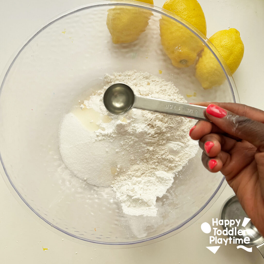 - Add the Wet Ingredients: Mix the vegetable oil, a few drops of yellow food coloring, and a few drops of lemon essential oil or a tablespoon of lemon juice. At the end add the 1 cup hot water and mix. This is a job for the adult or the more mature responsible participant. Slowly add the next 1/2 of hot water until you have achieved the desired consistency.