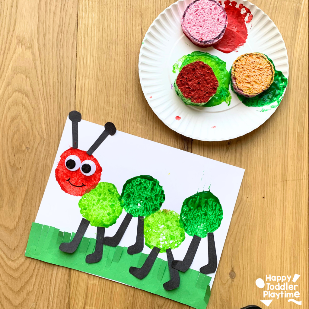 Cut a sponge into a circle, dip it in green paint, and stamp multiple times to make the caterpillar’s body. Use red for the head and add eyes!