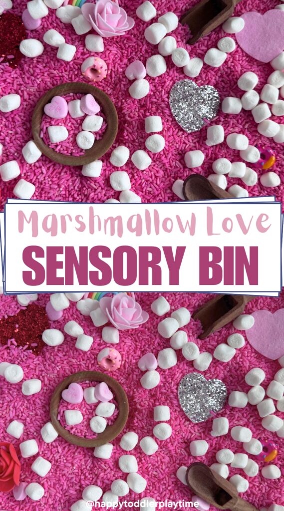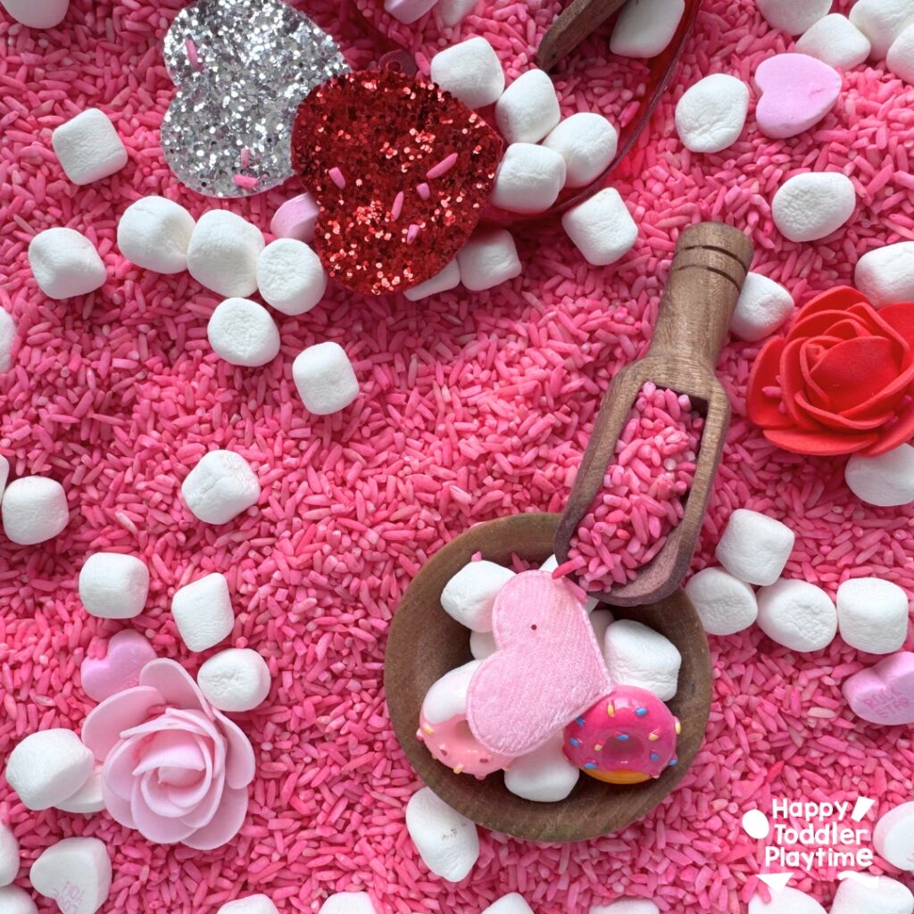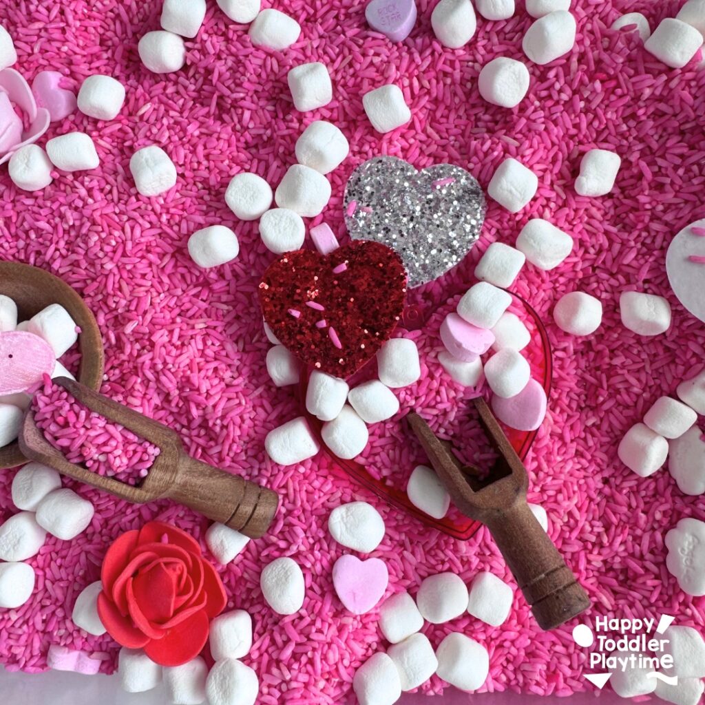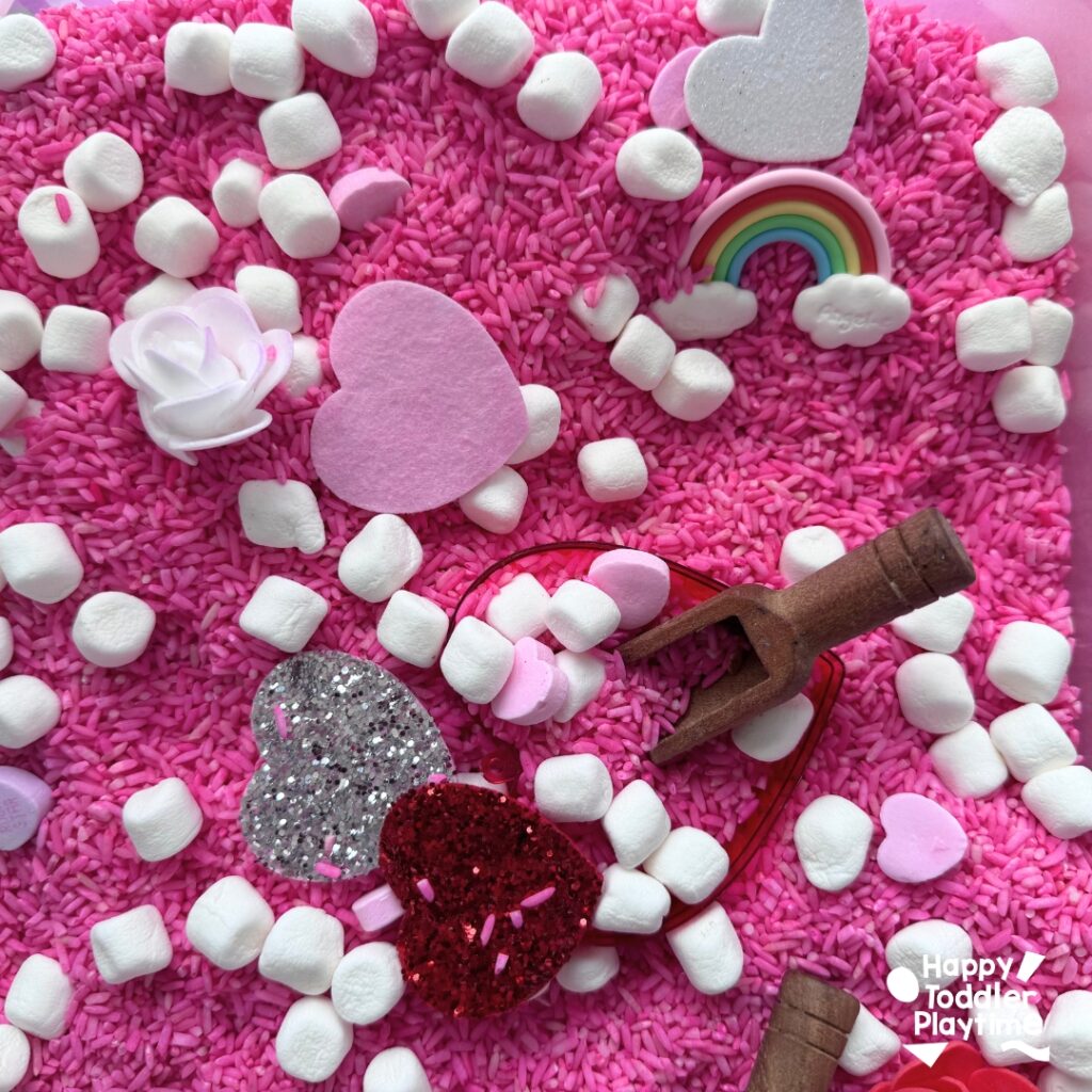 - Time to assemble the your marshmallow love sensory bin. Dump the pink rice into your sensory bin. Add in mini marshmallows for some soft, squishy texture. Toss in foam roses, glitter hearts, and candy hearts for a Valentine’s Day touch.