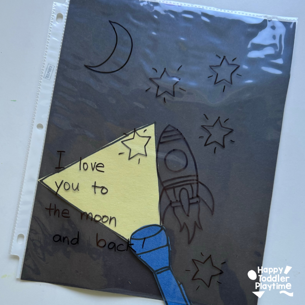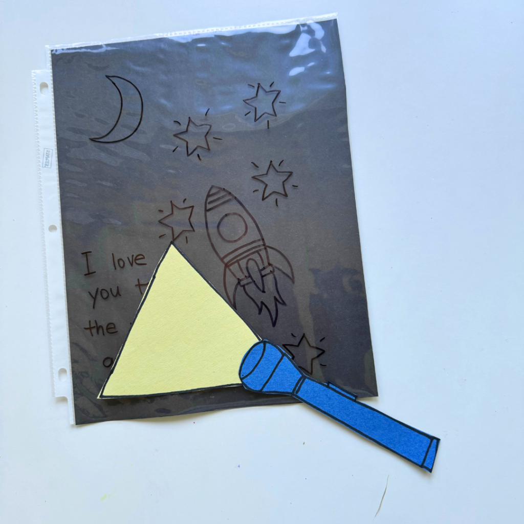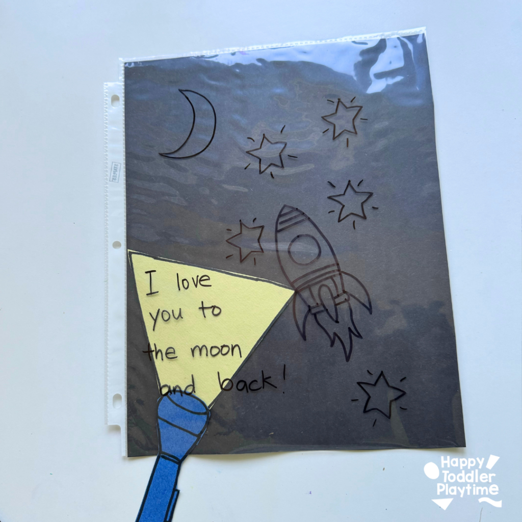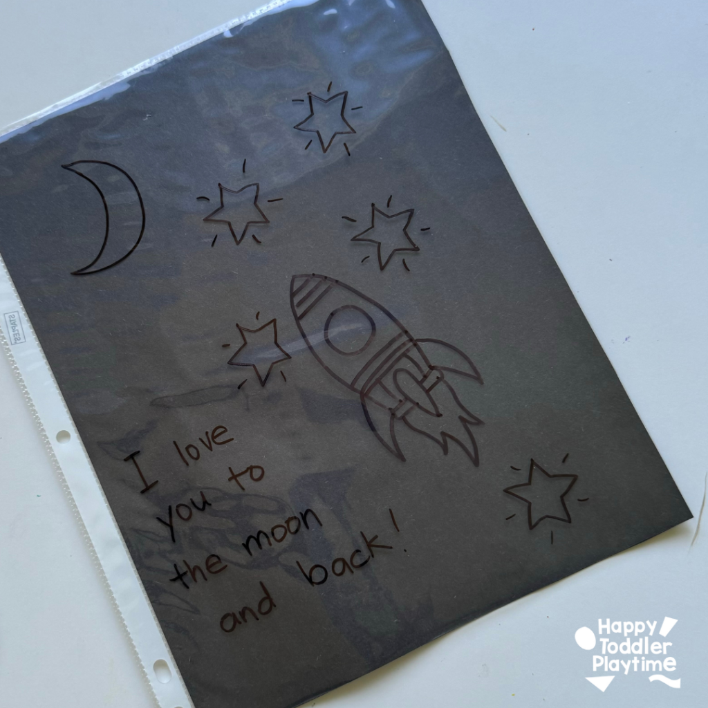 - Create the Mystery Picture: Take the clear plastic page protector and use your black permanent marker to draw a picture with a sweet message for dad. We love writing, “I love you to the moon and back” with some cute space doodles — but you can totally personalize it! Maybe your kid wants to draw dad’s favorite hobby, or a silly family portrait. Anything goes!