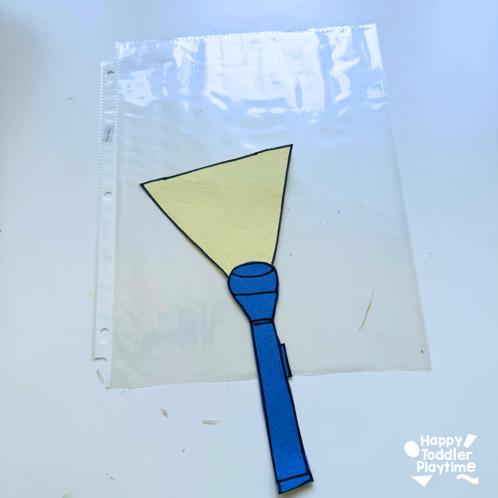 Glue or tape it to the end of your blue flashlight shape. Now you’ve got your special tool to reveal the hidden picture!