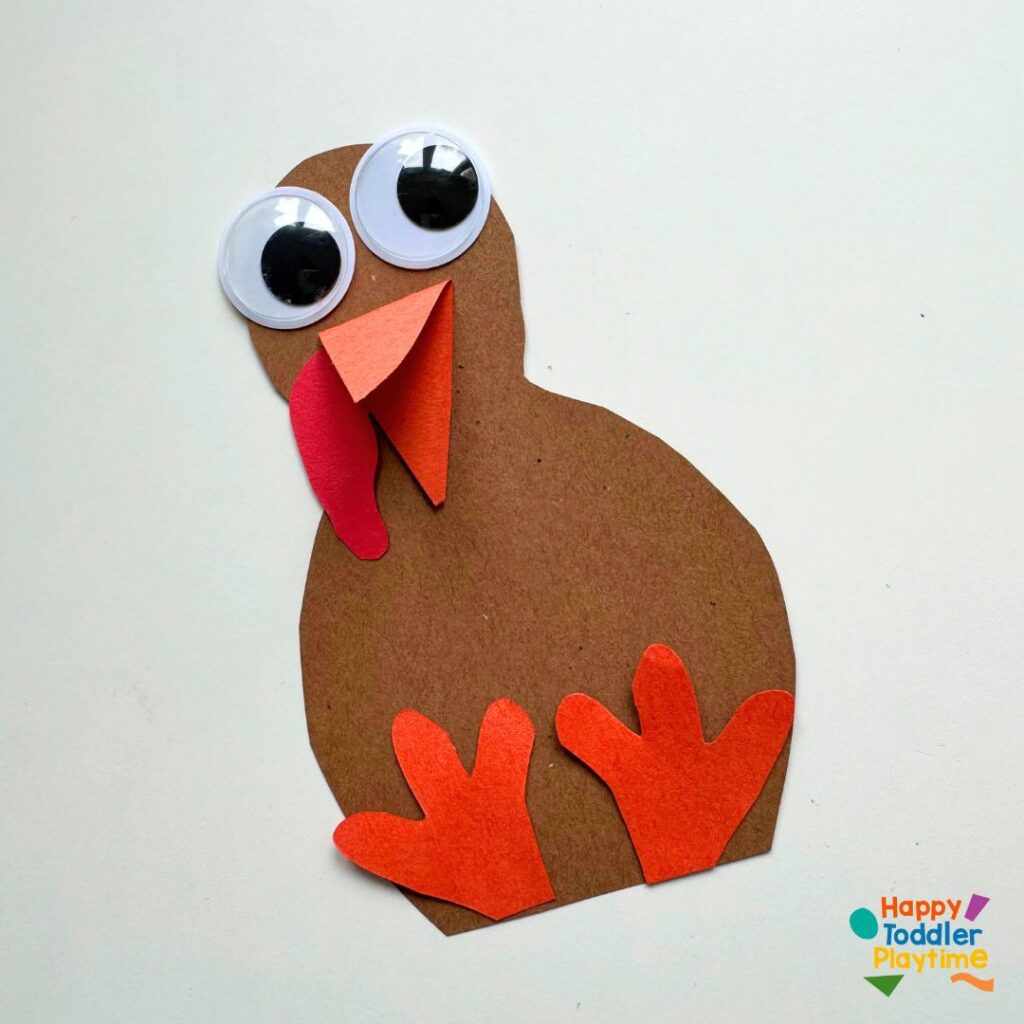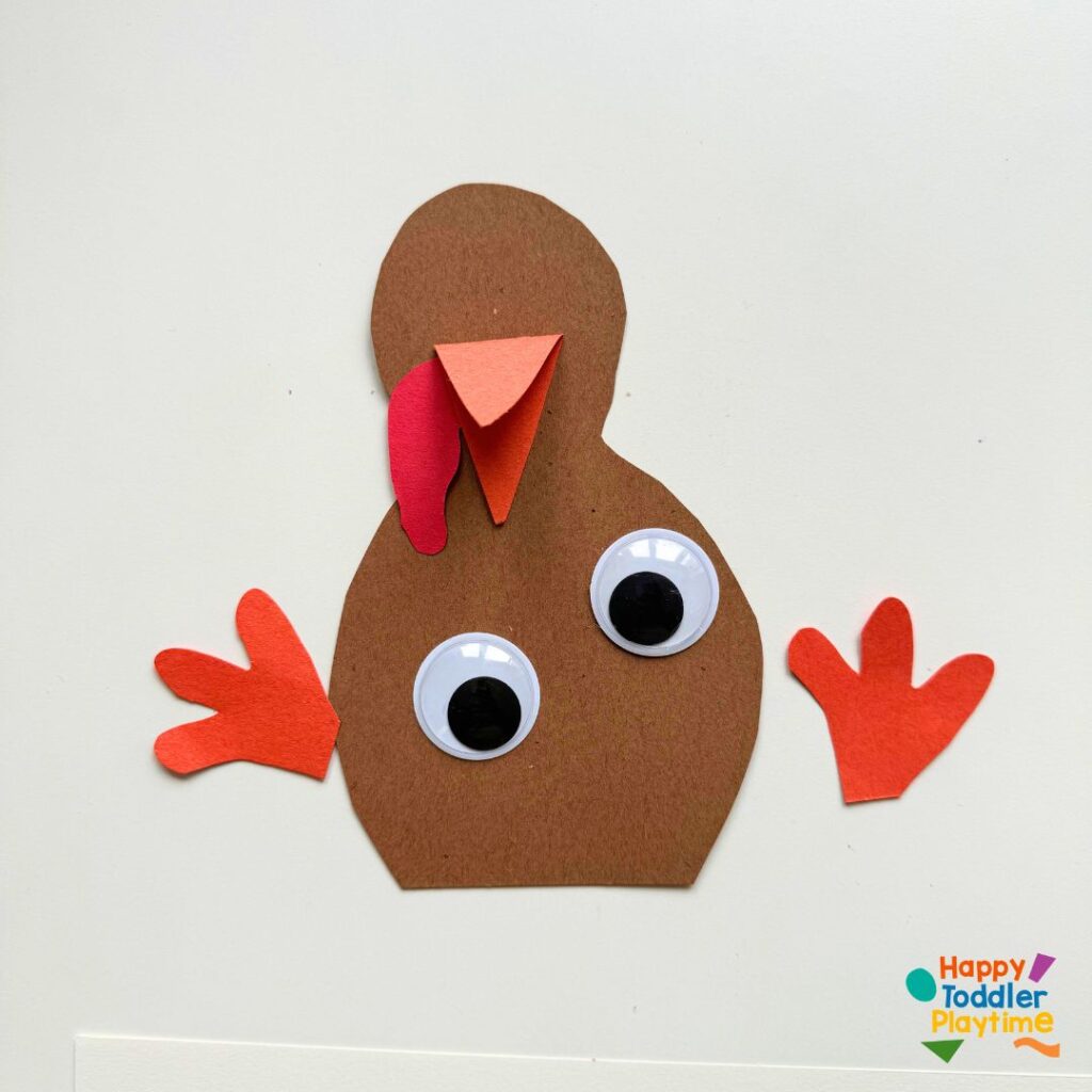 Cut out a turkey body, beak, snood (the wobbly red part), and feet from the brown and orange construction paper. Glue them together to form the turkey’s body. This is a step your child can help with—either by cutting and gluing or by simply gluing if they’re still practicing their scissor skills.