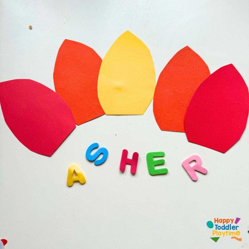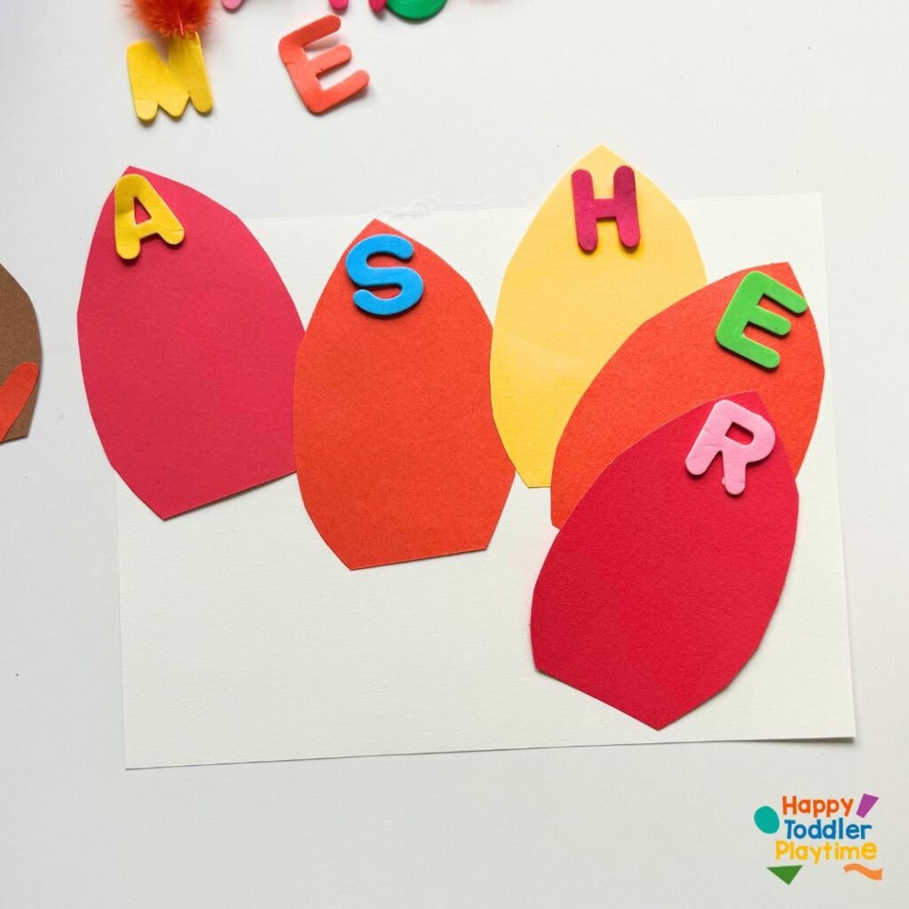 Start by cutting out feather shapes from the red, orange, and yellow construction paper. You’ll need one feather for each letter in your child’s name.