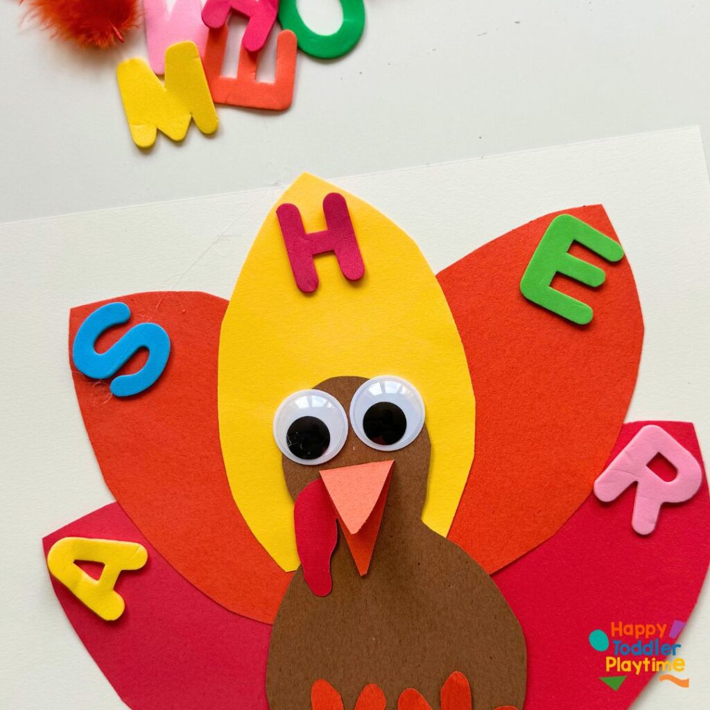On a sheet of white paper, arrange the feathers in a fan shape in the order of their name at the top to represent the turkey’s plumage. Then, glue the turkey body on top so that it sits in front of the feathers. Your child can finish by adding googly eyes to the face for a bit of character!