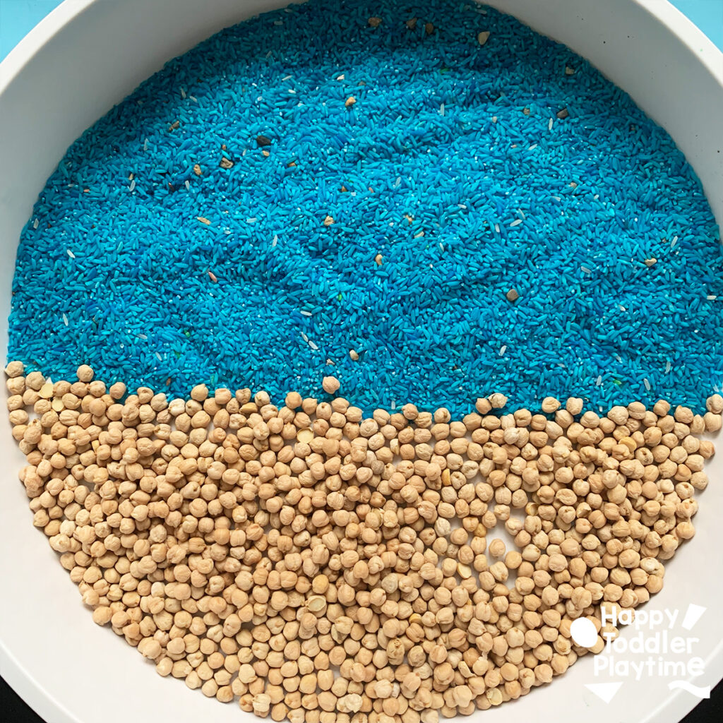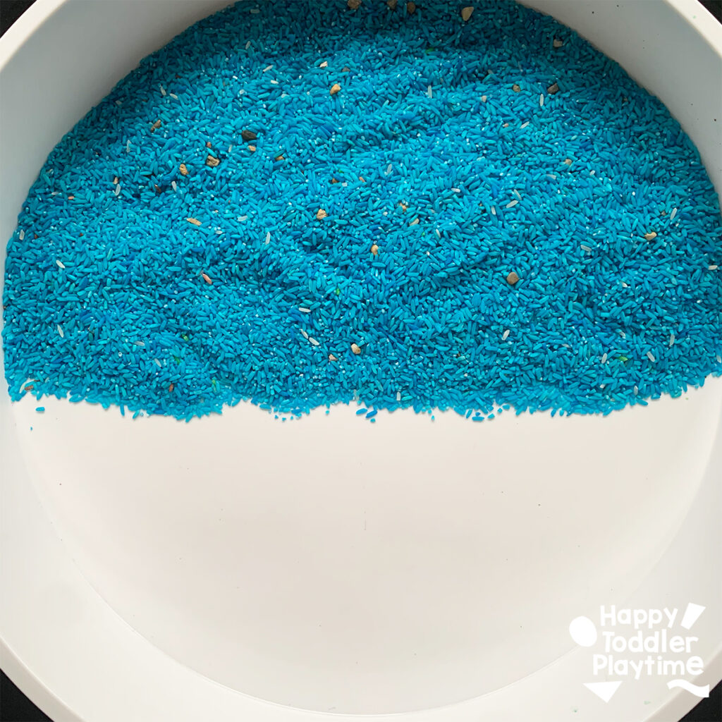 - Once your blue rice is ready, fill one side of the sensory bin with this mesmerizing ocean bed, laying the foundation for your underwater adventure.