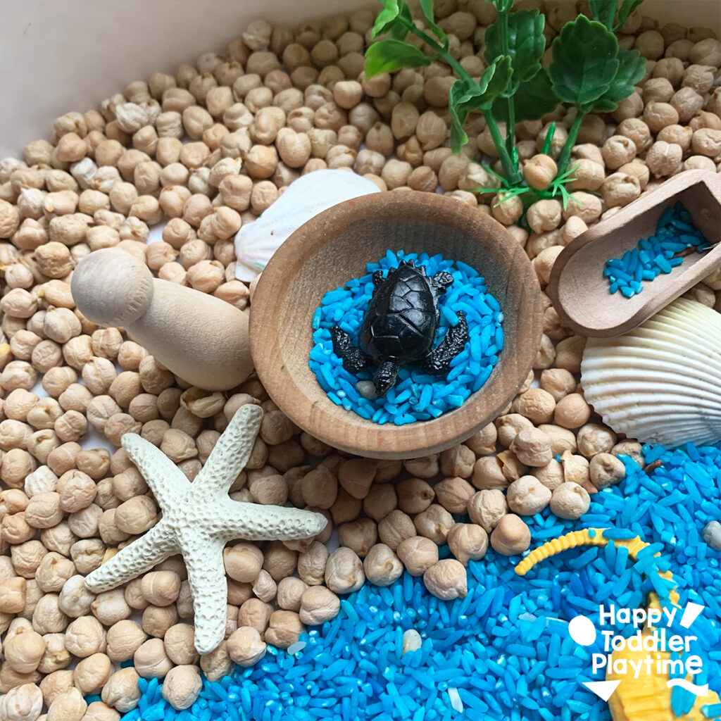 As your little ones dip their toes into this sensory wonderland, watch as their imaginations come to life! Armed with small scoopers, they’ll eagerly scoop up rice and chickpeas, exploring the textures and shapes while engaging their fine motor skills. Through imaginative play, they’ll embark on adventures, swimming alongside dolphins, diving with sharks, helping turtles and collecting seashells along the shore.