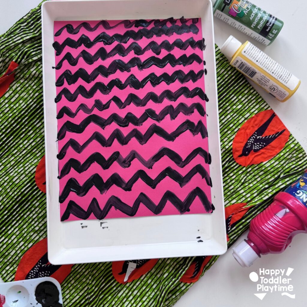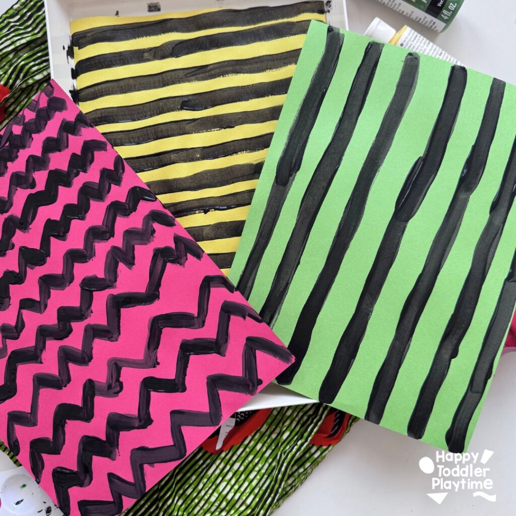 - Next, paint black lines on red, yellow and red construction paper. Again paint vertical lines on one, horizontal lines on another and zigzags on another or dots, triangles, and shapes. Set it aside to dry.
