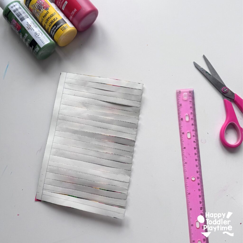 Draw lines starting from the fold to 1 inch from the end of the sheet. Do not cut all the way to the end. After drawing the lines, take scissors and cut along the lines.