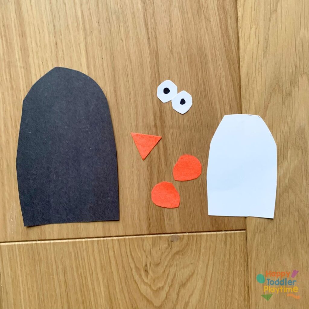 - Cut two small white circles for the eyes, a small orange triangle for the beak, and two orange circles for the feet.