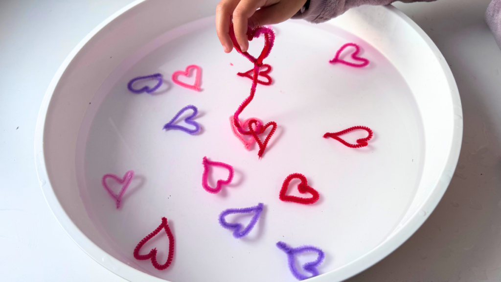 - Set up the sensory bin. Fill a sensory bin with about two inches of water, then gently drop the pipe cleaner hearts into the bin so they float and move around.