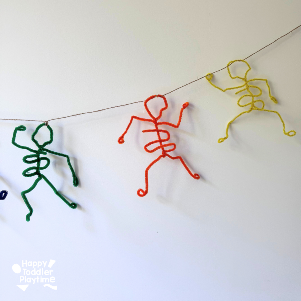 My kids and I loved creating skeletons in different colors—classic white, of course, but also neon green, purple, and even orange pipe cleaners for a little extra sparkle. Each one ends up looking unique, and when we string them all together, it makes the perfect homemade Halloween banner.