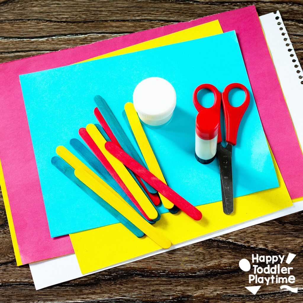 - Paint 5 popsicles sticks yellow, pink or blue. set them aside to dry. Tape 5 popsicle sticks together.