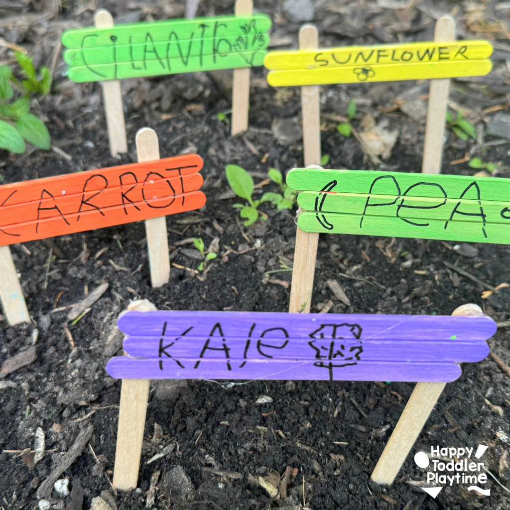 - Now for the fun part—stick your popsicle stick garden markers into the soil next to the plants!