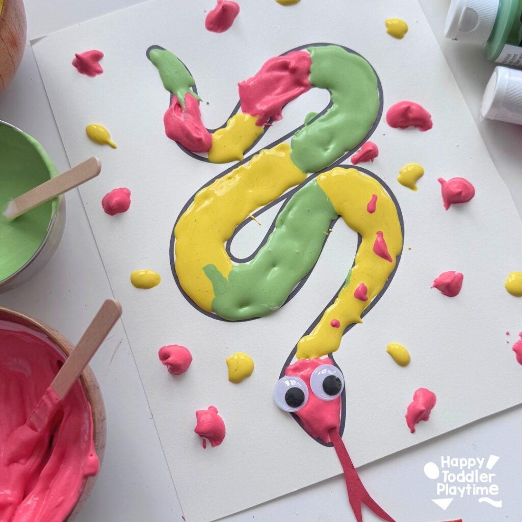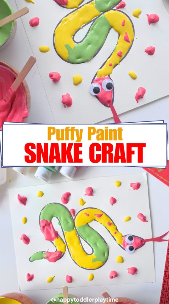 This Puffy Paint Snake Craft is a fun, squishy, and totally unique painting experience that kids will love. It uses my simple homemade puffy paint recipe made with just shaving cream and school glue, giving the snake a raised, 3D effect when it dries.