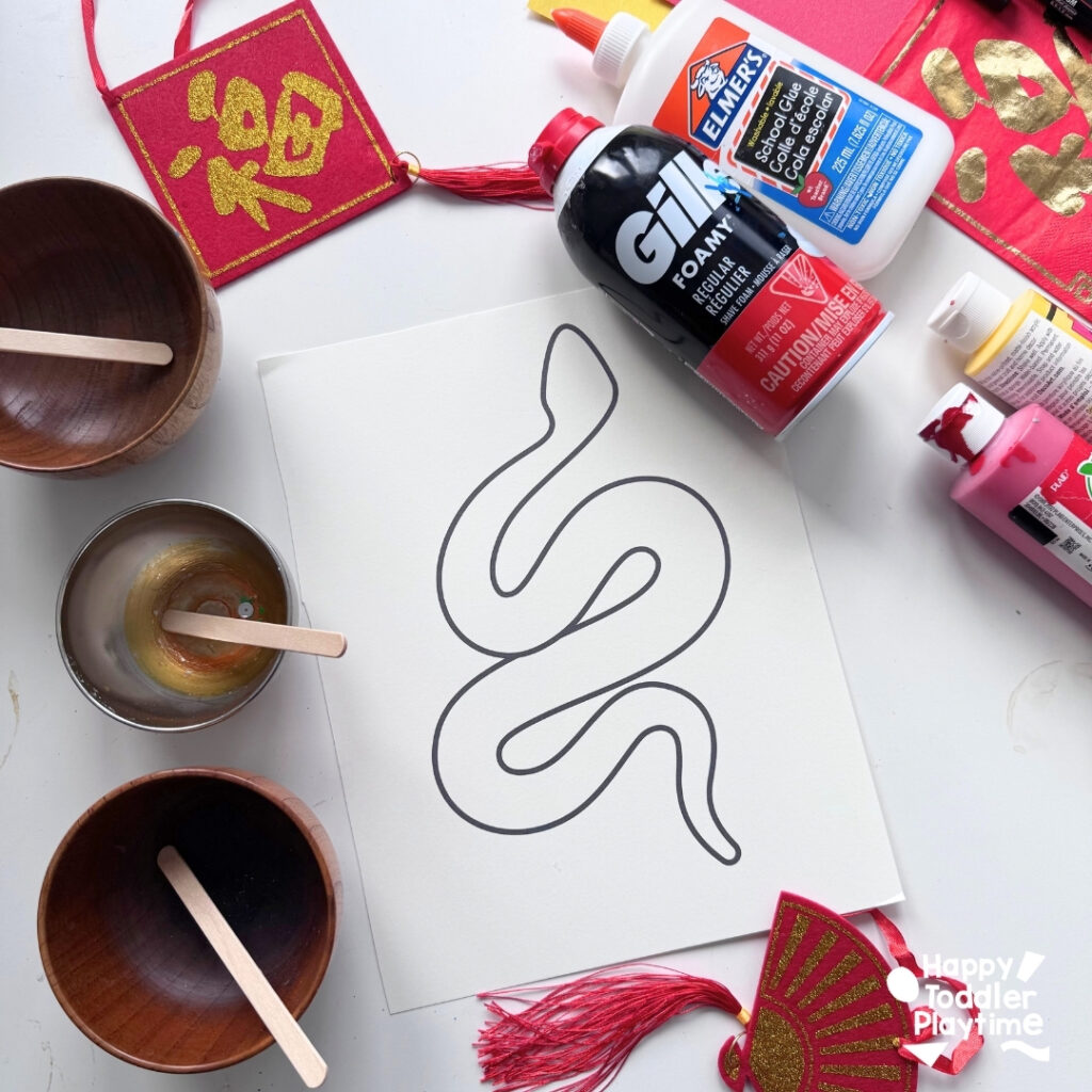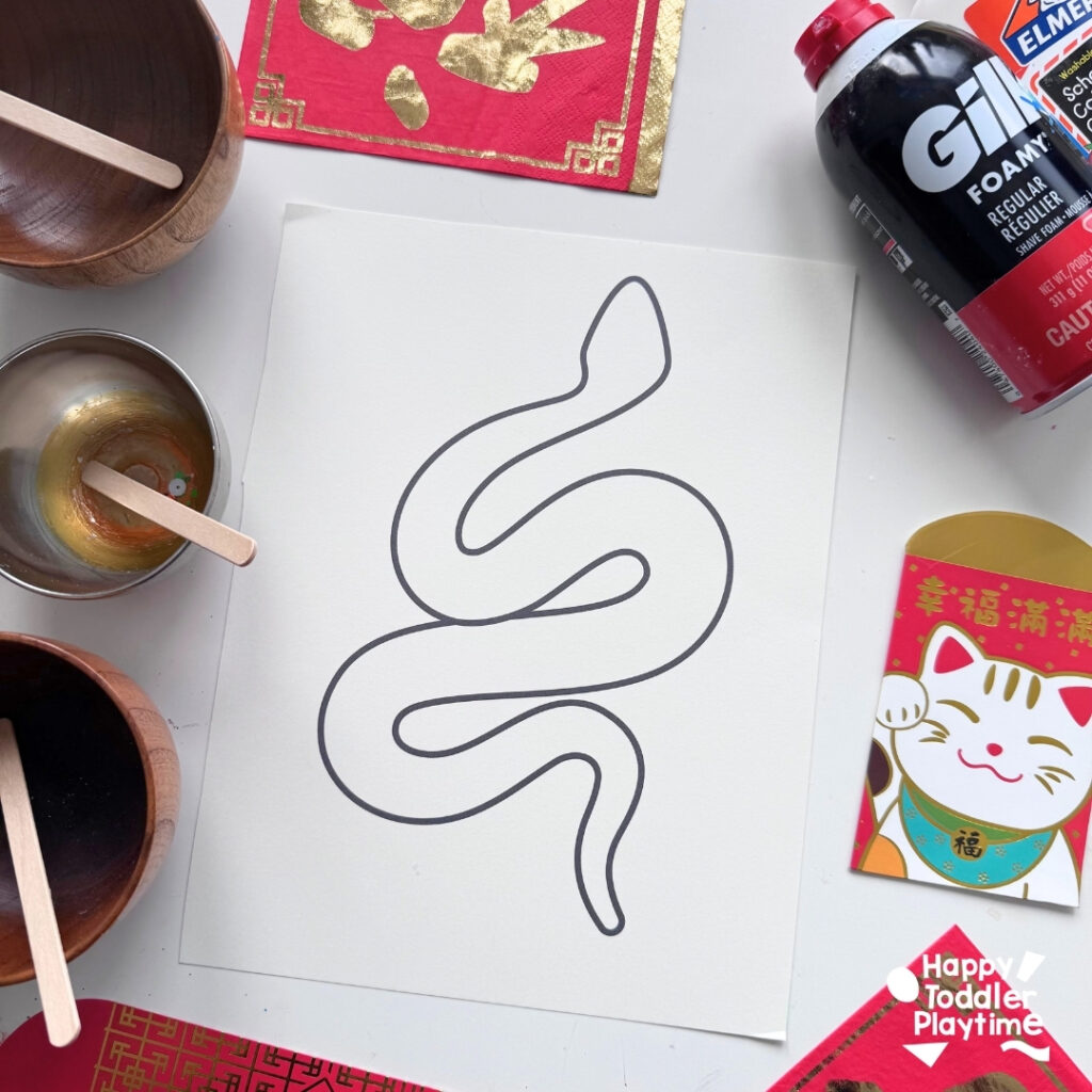 - Print out the snake template on cardstock or draw your own snake outline. Make it a simple, curvy shape so there’s plenty of space for the puffy paint!
