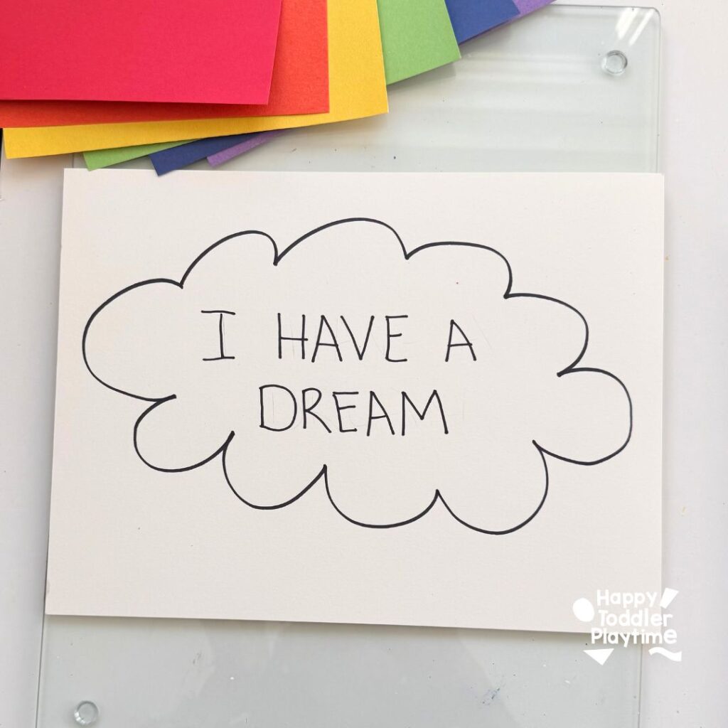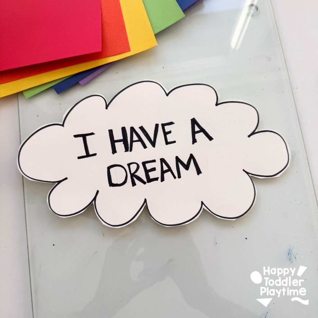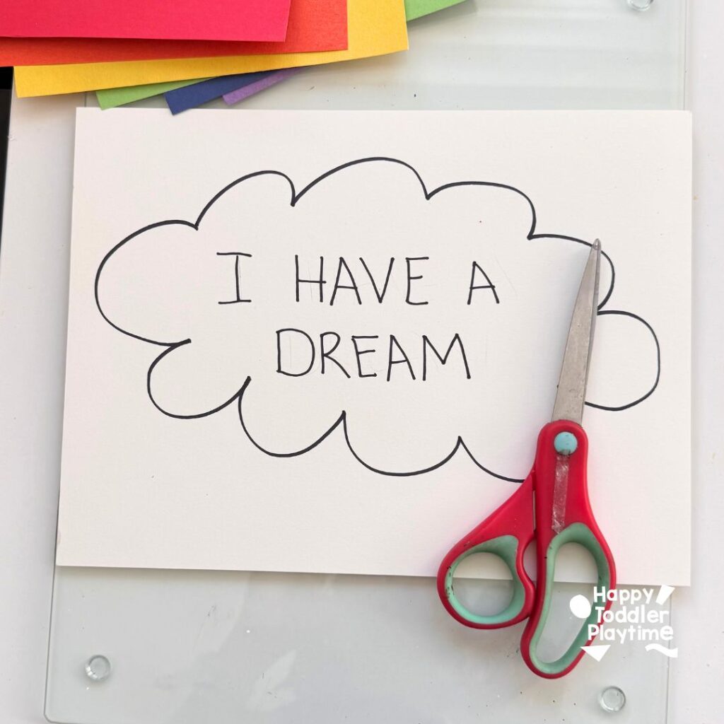On the white cardstock, draw an outline of a cloud. Inside the cloud write the words: ‘I Have A Dream’ then cut it out.