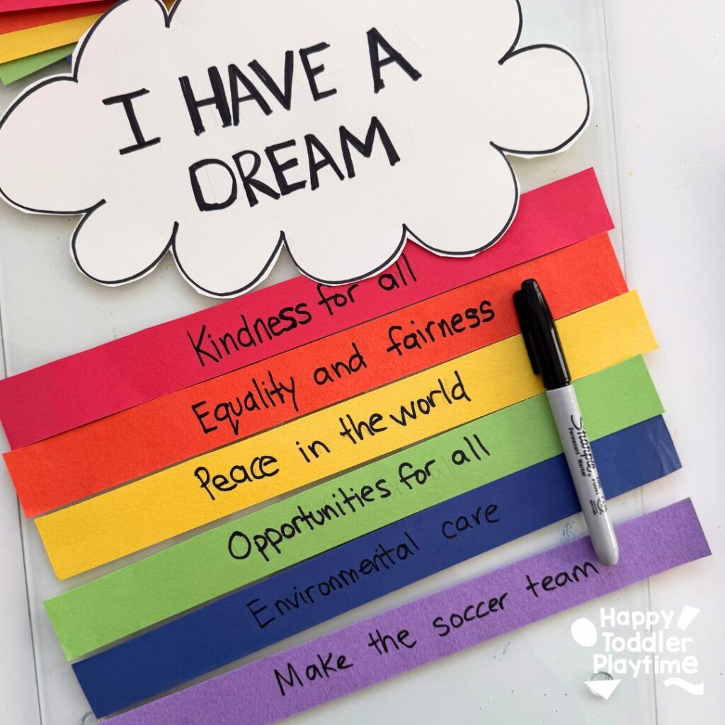 On each strip of paper, ask your child to write down a dream or goal they have. These can be personal aspirations like “I want to be a kind friend” or broader hopes like “I dream of a world where everyone is treated equally.” For younger children, you can write their dreams for them as they share their ideas.