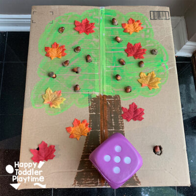 For toddlers you can skip the dice and invite them to just push and drop the leaves and acorns down the holes for a fun fine motor activity! For older kids 5-6 years old you can give them simple subtraction math problems to solve. Such as 4 minus 1 equals.