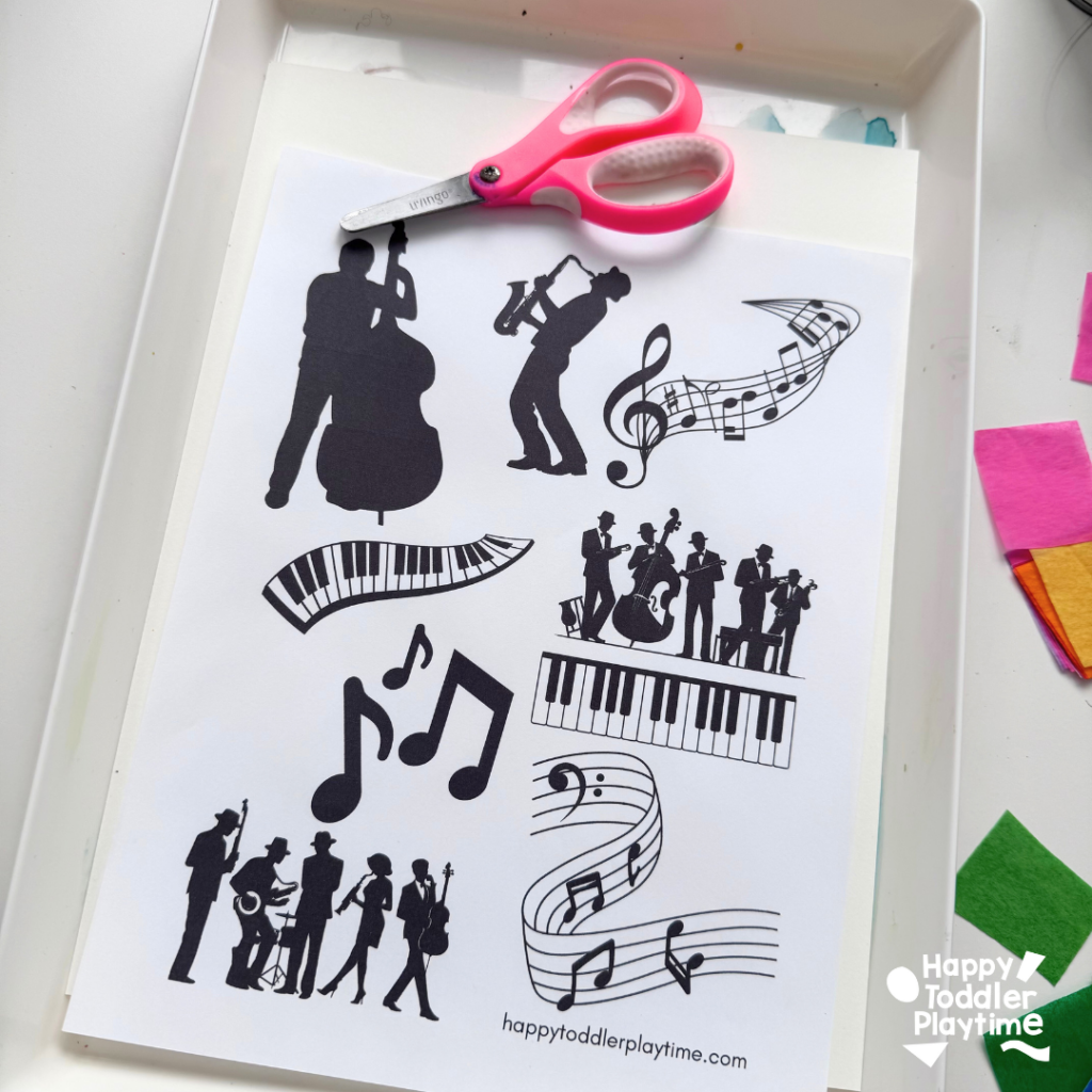 - While you wait for the tissue paper to dry, print out the jazz musician printable below and cut out the images.