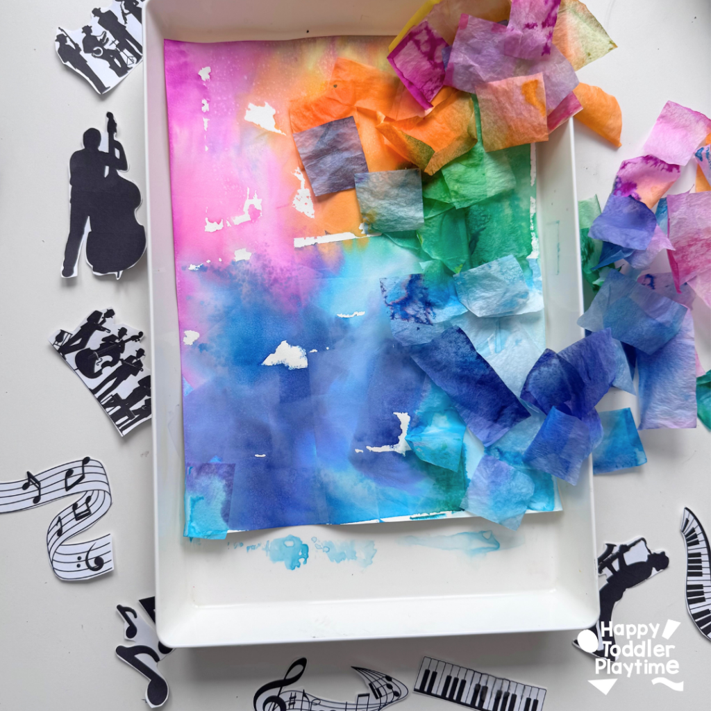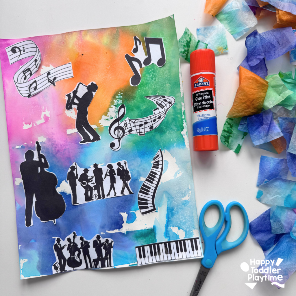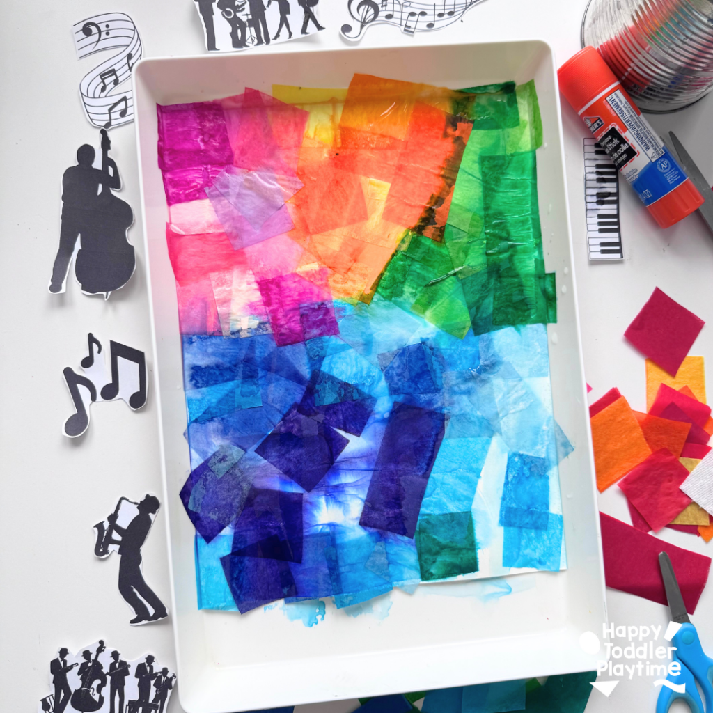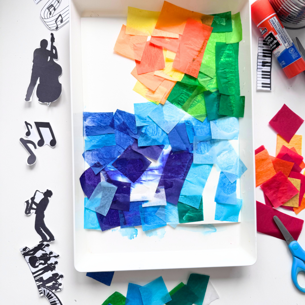 This Romare Bearden-inspired art project is a fun and creative art project that also helps kids learn about history and culture! A colorful collage, using bleeding tissue paper and images of musicians! Perfect for little artists who love to cut, glue, and create.