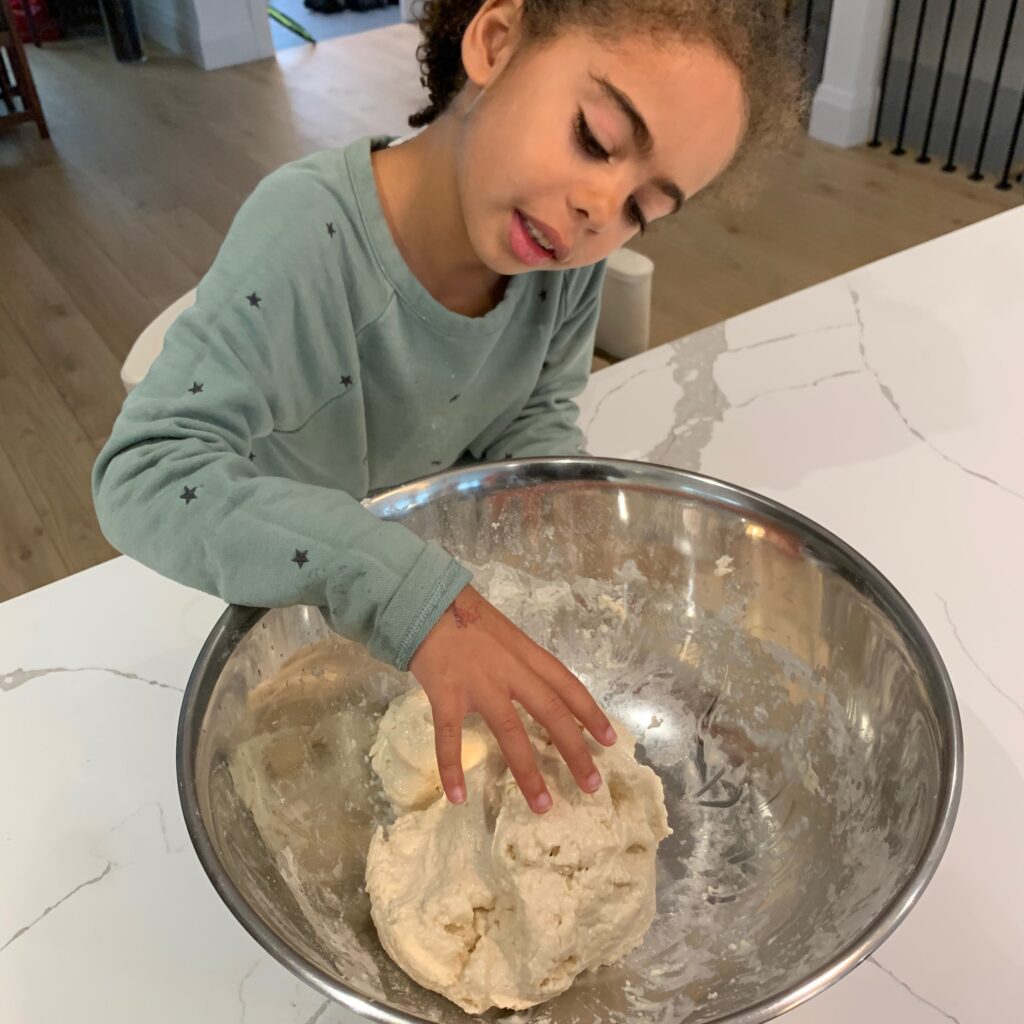 In a large bowl, combine the flour and salt. Gradually add water while stirring, until you form a dough with a consistency similar to Play-Doh. If the dough is too dry, add a bit more water a teaspoon at a time. If it’s too sticky, sprinkle in a little more flour.